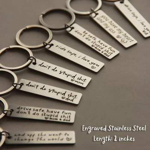 Return Policy Fast Delivery Trusted seller Engraved Key Chain, Drive Safe Have Fun, Dad Gift to Kids, Graduation Keychain, New Driver, Gift from Dad, Gifts from Parents, Be Safe Keychain Product Description Don't Do Stupid Shit Keychain: A humorous and lighthearted engraved metal keychain, serving as a reminder with a touch of humor. Keychain Dimensions: Compact and stylish, with dimensions of 1/2"x2", and constructed with stainless steel rings and key rings, ensuring durability and a sleek aesthetic. Gift from Dad: A thoughtful gift from mom to her kids, daughter, or son, expressing care and humor in a practical accessory. Engraved Metal Keychain: Crafted from durable stainless steel, this keychain is engraved with a witty message, adding a personalized touch. Funny Keychain Gift: A uniquely amusing keychain gift from dad for kids, offering both a practical and humorous element to daily life. Shipping Returns Payment Shipping Shipping is FREE to all addresses other than APO/PO boxes in the lower 48 states. All our stock ships from US-based warehouses. Shipped via USPS or UPS (depending on location and package weight) Unless stated otherwise, all orders will ship within 24-72 hours of your payment being processed. Check our feedback to see the great reviews of FAST shipping we offer. Returns Seller does not accept returns Payment We currently accept payment via eBay managed payments only. Once payment is cleared, we will dispatch your shipment within 1-3 business days. Please refer to the "Shipping" tab for more information regarding shipping speed to your destination.