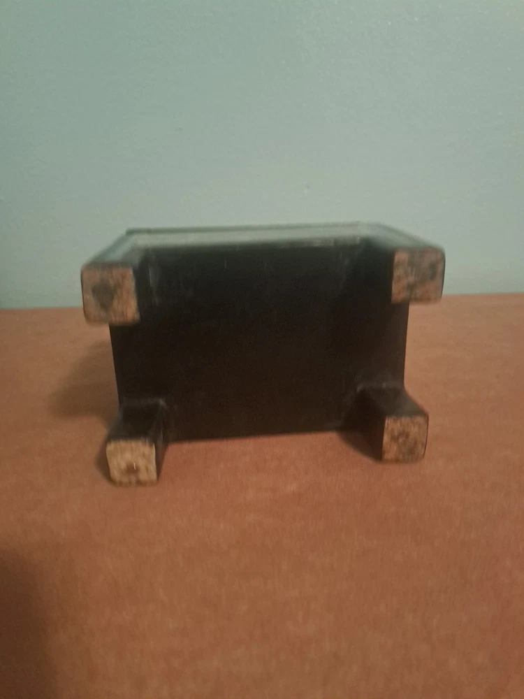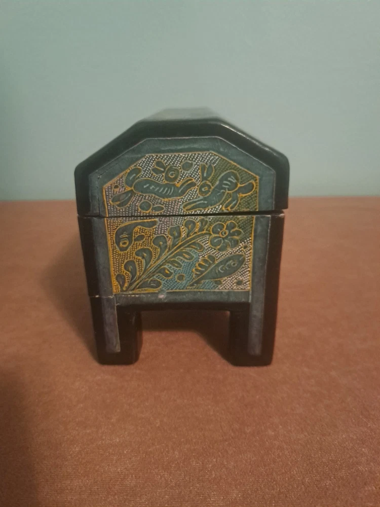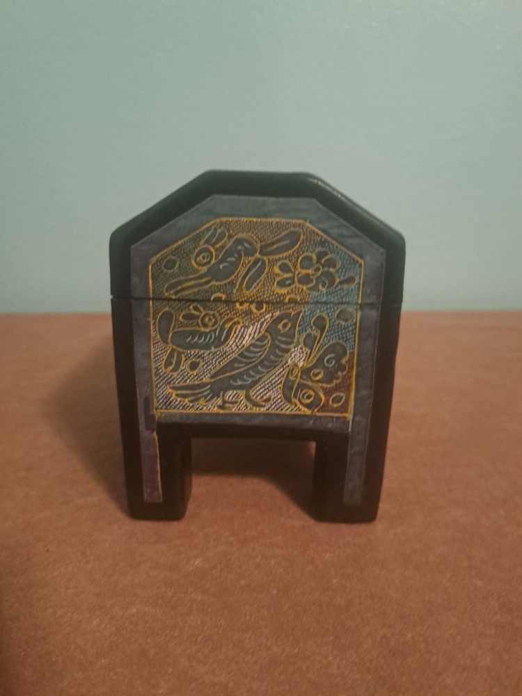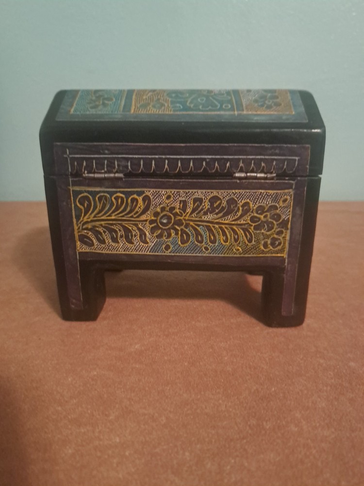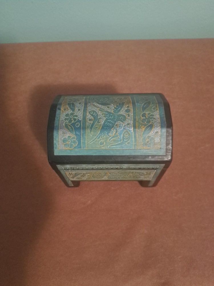 Engraved Turquoise Jewelry Chest Wood Trinket Box. No markings, looks India. Black with turquoise birds and fish. Measurements in about this item.