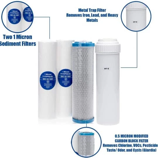 Complete refill kit for "Enhanced Portable RV Water Filter System with Iron and Heavy Metals Water Filtration". A1108 1 micron Sediment Filter - lasts ~2-3 months A1209 0.5 micron Carbon Block Filter - lasts ~4-6 months A1415 Metal Trap Filter - lasts ~6000 gallons, 6-12 months *note* filter lifespans are based on full time useage and will vary depending on water source quality and total daily usage