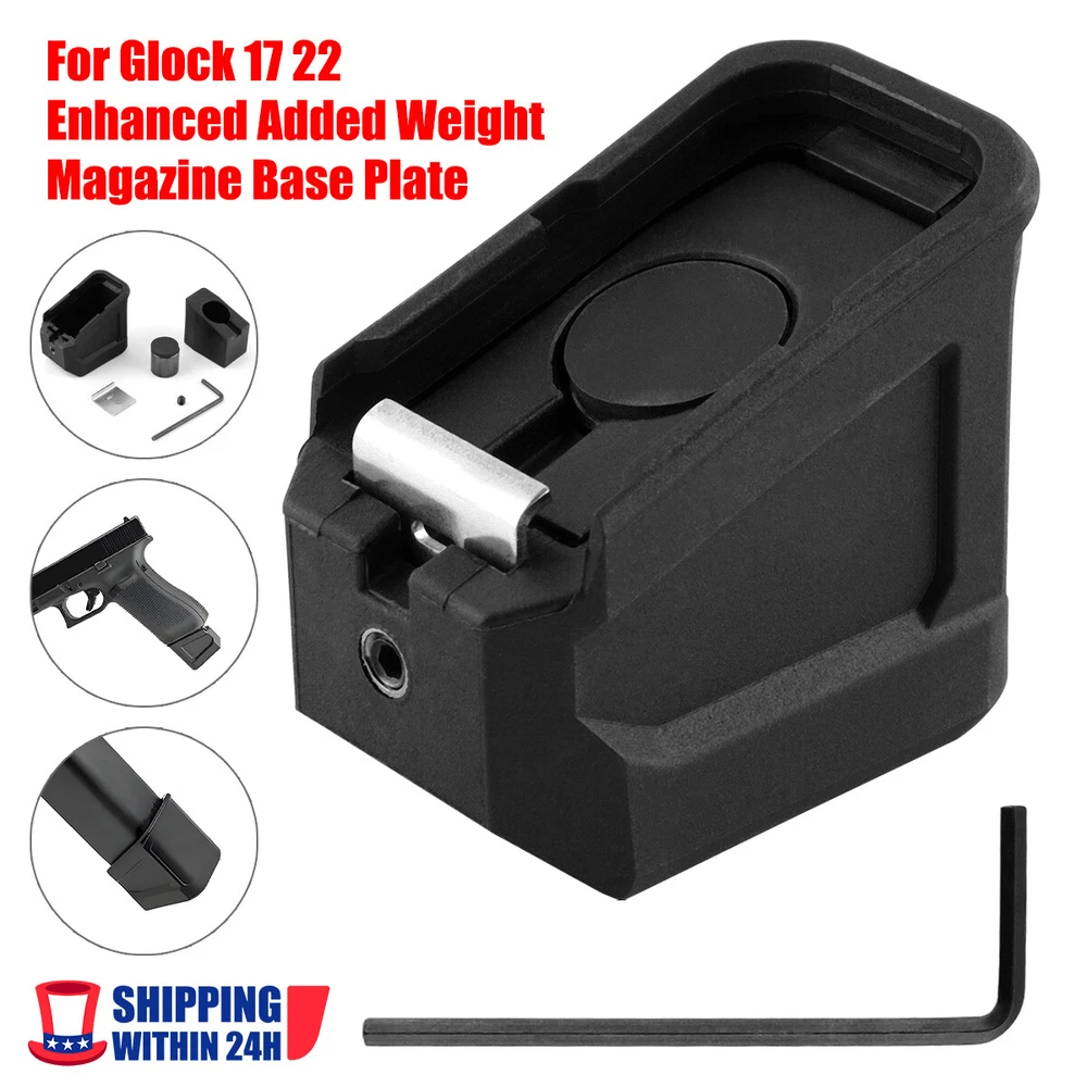 Product Description Features: 1 effectively increase the weight of the magazine bottom, greatly improve the feel of the magazine, and speed up the magazine replacement. Built-in detachable weight gain block, quick release design, can be used according to their own usage habits. 3. The bottom plate adopts the design of slide rail quick release, which is simple to install and disassemble, and does not need to spend much time and use other tools. 4 the extended bottom plate can also effectively increase the length, increase the holding space of the little finger and improve the holding comfort. 5. Made of reinforced mixed materials, it is hard and durable. 6 Please note that the base plate does not increase the excess magazine capacity. 7 pistol with original magazine for Glock Models 17 and 22. Parameters: Material: nylon metal Function: Increase weight and increase replacement speed and grip feel. Application: Glock Models 17 and 22 Increase capacity: No. List: 1 x Enhanced Added weight Magazine base plate 1 x Optional steel weight 1 x Rubber Spacer 1 x Screw 1 x Wrench WARNING: DO NOT OVERTIGHTEN set screw when installing the steel locking plate. Steel locking plate may appear "loose" however when the set screw is flush with the back of the body, you do not have to tighten any more. Overtightening from this point on will potentially damage your product. Payment Shipping Terms Returns Contact Us We accept PayPal only. If buyer want to delay the payment because of financial problem, please contact me by the ebay message within 3 days Payment via PayPal (PayPal accepts all major credits/debit cards and eCheque) ECheque payment will tak e 3-10 days to get clear, thus DELAYing the shipment. Handling time: 1 business day (Orders are not processed on weekends & holidays) Tracking information will be sent once item is shipped. Local pick-up is unavailable at the moment. For international shipping and shipping to Guam, Hawaii and Alaska, Please contact us before placing the order. Item is shipped to ebay address. Leaving correct address can minimize delay. For any issues with Defects, Return, Item Exchange request, please contact us first and send us a message first before opening any type of case or request. We devote ourselves making EVERY CUSTOMER in 100% Satisfactory and resolve any problem. We highly value and appreciate your business. Thank you. No returns will be accepted without an RMA number. Please contact us for the RMA number. Return is acceptable within 30 days of delivery. Return for replacement or money back is optional. Returned items must be in the brand new, unaltered and resalable condition. Seller is not responsible for any labor cost, expense in a dealer store, or damage due to wrong installation. Return is accepted within 14 days after the buyer's receiving the item. (Excluding contrived damagement or misusage).100% money-back Guaranteed! All product will be tested in 100% before delivery.If the item is defected by the processing of postage,Buyer has up to 14 days from date of receipt for exchange of a new one.All shipping charges for returned products are to be paid by the buyer,Please contact us for the return address All messages will be answered within 24 office hours. Please contact us either by clicking "contact seller" in the "purchase history" section or simply click "ask a question" at the bottom of this page. If you are unsatisfied with our item or service, please contact us before leaving any feedback. We are committed to resolve all issues in a friendly and satisfactory manner. We always reply to messages within 2 business days (off-duty at weekend). If you do not get a response from us, then please check your junk or spam mailbox. Payment We accept PayPal only. If buyer want to delay the payment because of financial problem, please contact me by the ebay message within 3 days Payment via PayPal (PayPal accepts all major credits/debit cards and eCheque) ECheque payment will tak e 3-10 days to get clear, thus DELAYing the shipment. Shipping Handling time: 1 business day (Orders are not processed on weekends & holidays) Tracking information will be sent once item is shipped. Local pick-up is unavailable at the moment. For international shipping and shipping to Guam, Hawaii and Alaska, Please contact us before placing the order. Item is shipped to ebay address. Leaving correct address can minimize delay. Terms For any issues with Defects, Return, Item Exchange request, please contact us first and send us a message first before opening any type of case or request. We devote ourselves making EVERY CUSTOMER in 100% Satisfactory and resolve any problem. We highly value and appreciate your business. Thank you. No returns will be accepted without an RMA number. Please contact us for the RMA number. Return is acceptable within 30 days of delivery. Return for replacement or money back is optional. Returned items must be in the brand new, unaltered and resalable condition. Seller is not responsible for any labor cost, expense in a dealer store, or damage due to wrong installation. Returns Return is accepted within 14 days after the buyer's receiving the item. (Excluding contrived damagement or misusage).100% money-back Guaranteed! All product will be tested in 100% before delivery.If the item is defected by the processing of postage,Buyer has up to 14 days from date of receipt for exchange of a new one.All shipping charges for returned products are to be paid by the buyer,Please contact us for the return address Contact Us All messages will be answered within 24 office hours. Please contact us either by clicking "contact seller" in the "purchase history" section or simply click "ask a question" at the bottom of this page. If you are unsatisfied with our item or service, please contact us before leaving any feedback. We are committed to resolve all issues in a friendly and satisfactory manner. We always reply to messages within 2 business days (off-duty at weekend). If you do