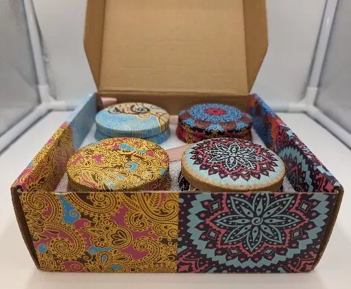 Enjoy Your Life 4 Piece Spice Up Your Life Aromatherapy Gift Soy Candle Set. None of the candles has ever been lit. The box has a slight amount of shelf wear but is still completely acceptable. Please see the photos. The four fragrances are Fig, Lemon, Lavender and Spring Flavor. Just opening the box lets out a wonderful aroma. They are made from soy wax and American essential oils. All of my items are carefully packed for shipping, no matter their value - $5 items are wrapped with the same care as a $200 item. My goal is to have your purchase arrive safely. I use recycled packaging when possible but mostly use new, high quality products so your item will arrive intact without damage. Large, heavy and fragile items are harder to use combined shipping with but just ask if you would like to purchase more than one item and I am more than happy to do so if feasible. If not, maybe we can work out a shipping discount. Thank you and hopefully you will visit my store again!