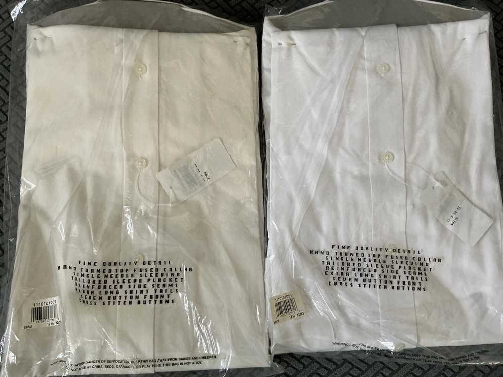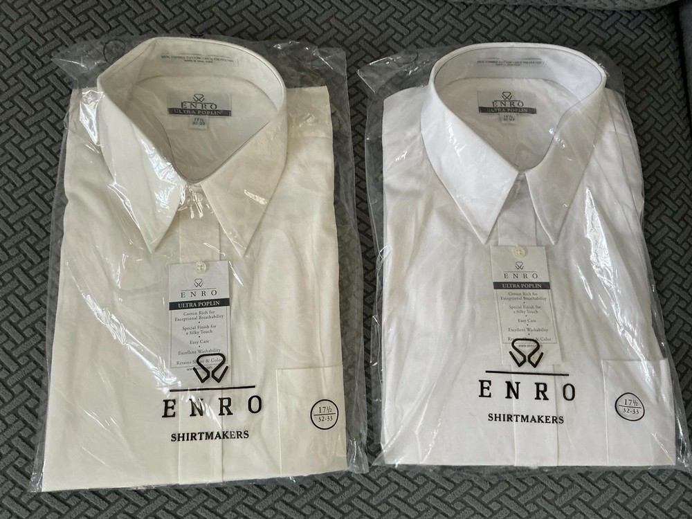 2 new Enro men’s dress shirts, 1 is white and the other is ecru. Both are neck size 17.5” and 32-33” sleeves