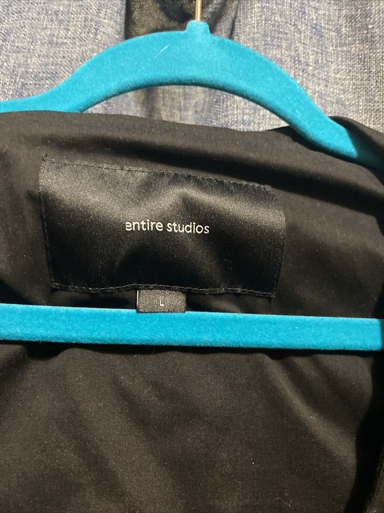 The Entire Studios Men's Puffer Vest in size Large is a stylish and practical piece for the winter season. Made with a cotton blend outer shell and insulated with down, this vest offers warmth and comfort for casual occasions. The solid black color and puffer jacket style make it a versatile option for everyday wear. With machine washable care instructions, it is easy to maintain and keep looking fresh. Perfect for staying cozy and on-trend during the colder months.