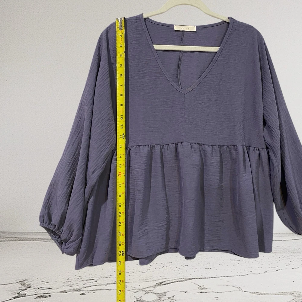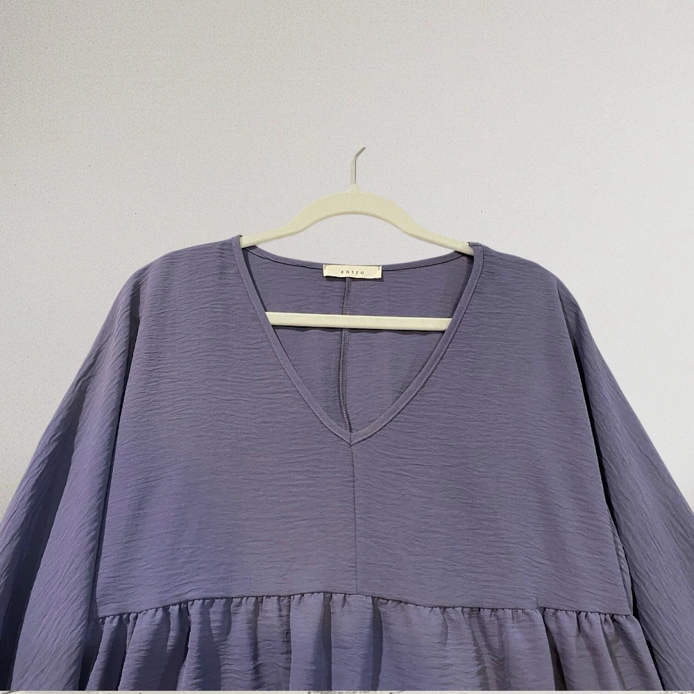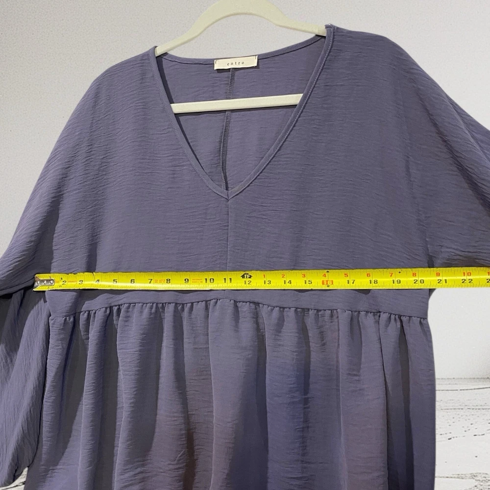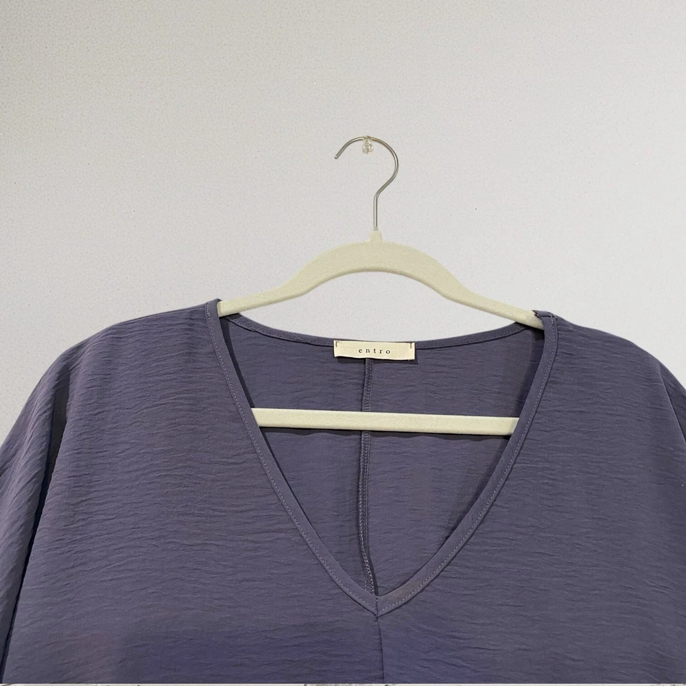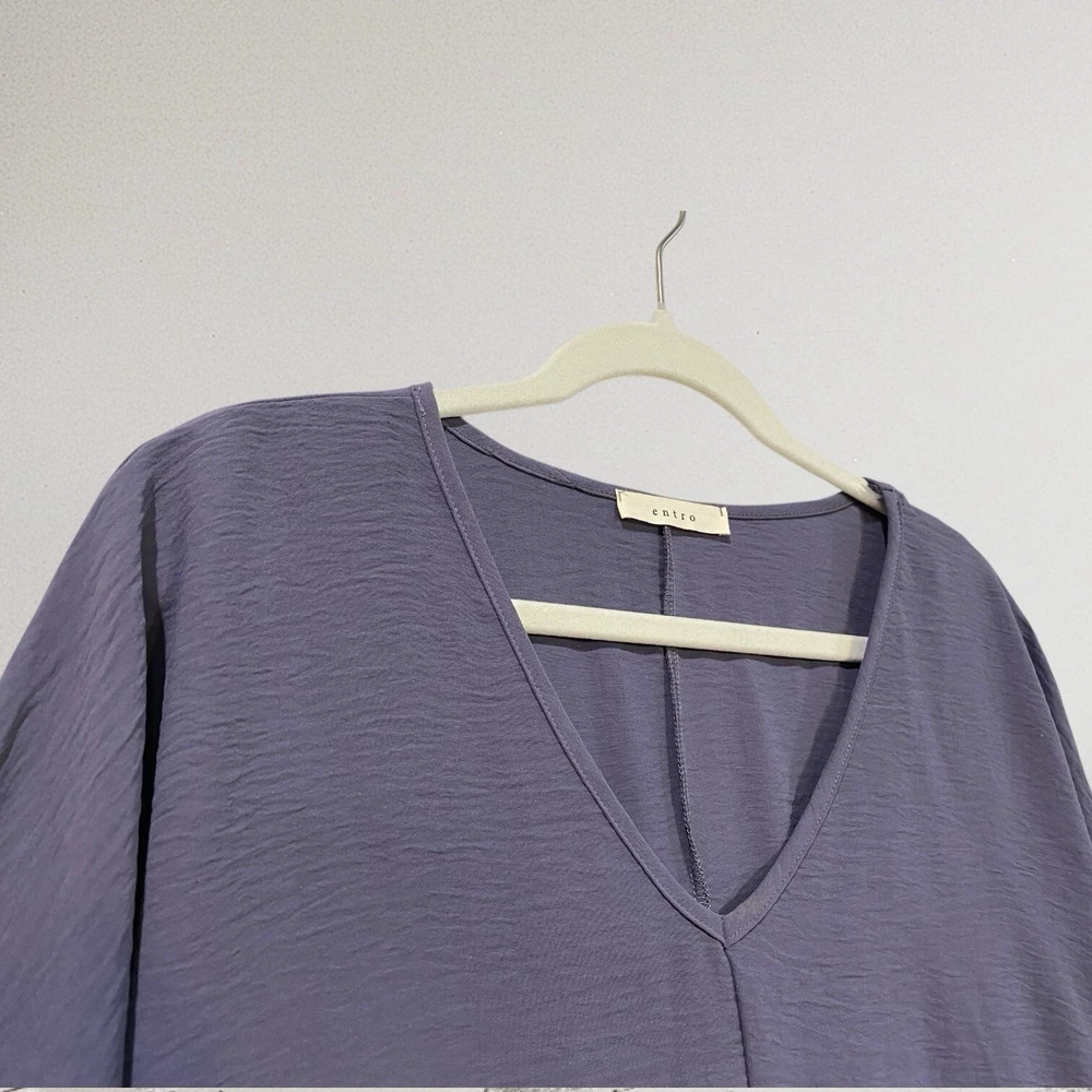 Accents: Pleated, Textured Sleeve Type: Balloon Sleeve Pattern: Solid Neckline: V-Neck Country of Origin: United States Features: All Seasons, Oversized Material: Polyester Department: Women Theme: Bohemian, Boho Chic, Babydoll Tops, Y2K, Casual Chic Size: S Type: Blouse Closure: Pullover Color: Purple / Blue Size Type: Regular Style: Basic Brand: Entro Sleeve Length: 3/4 Sleeve Fit: Relaxed