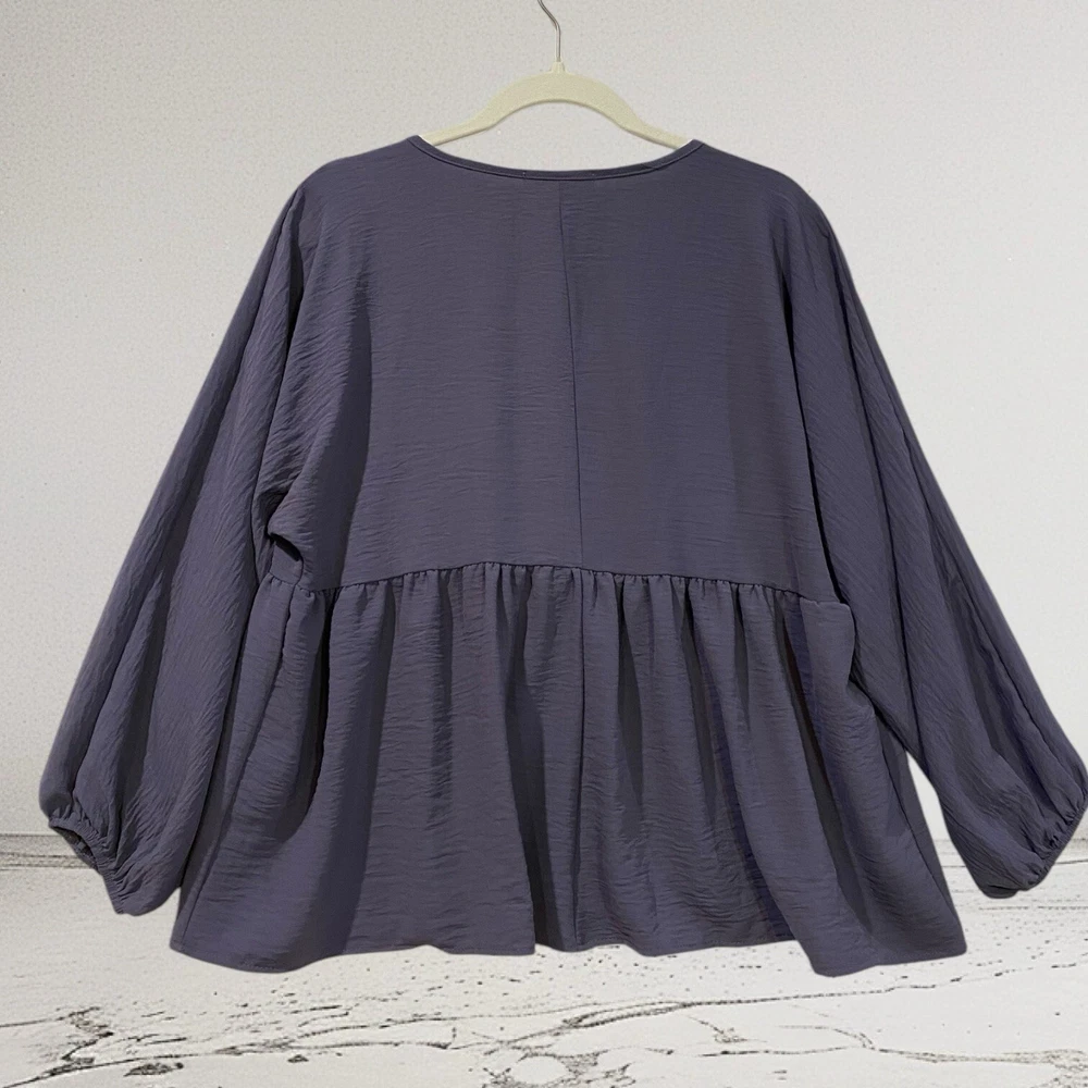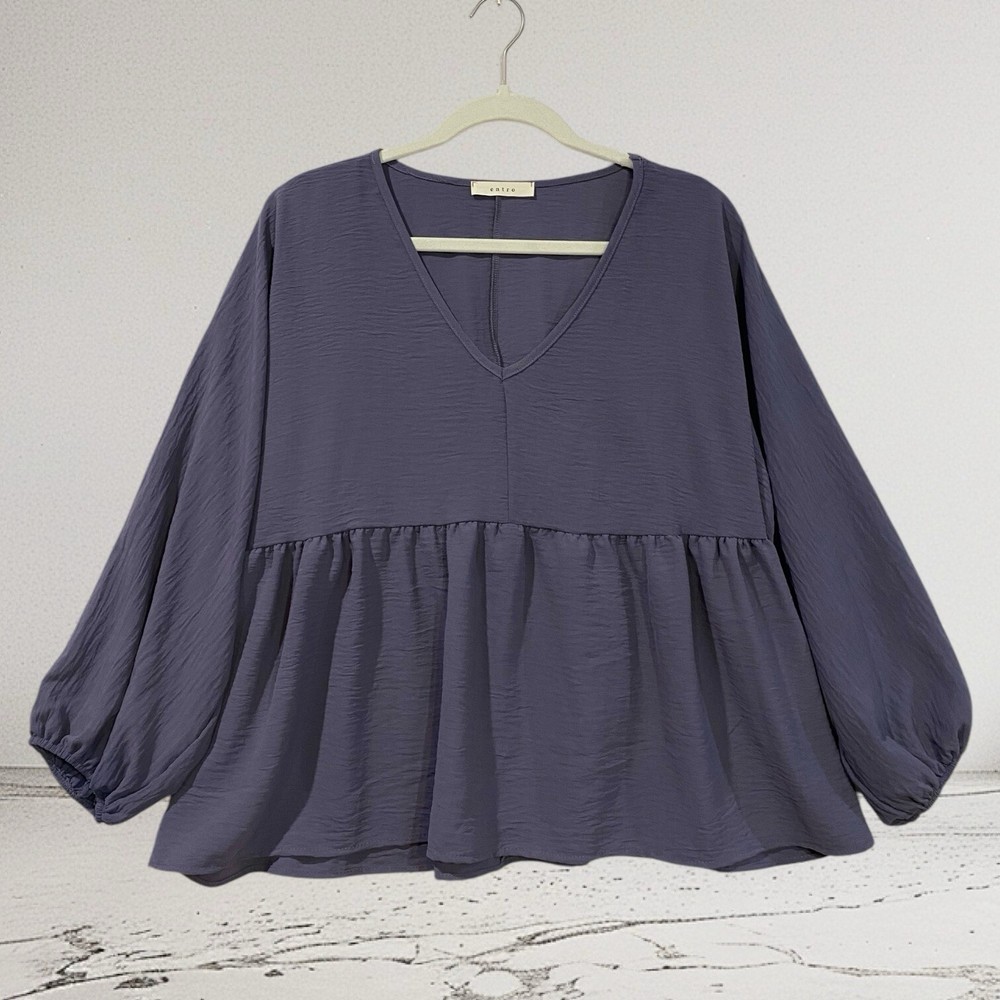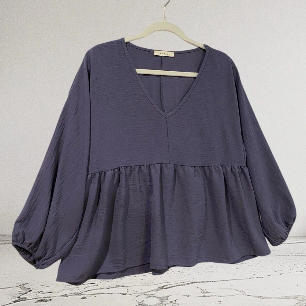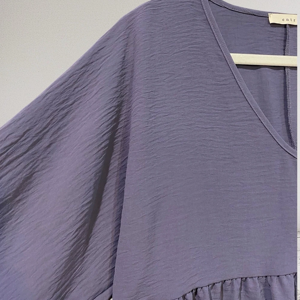 Accents: Pleated, Textured Sleeve Type: Balloon Sleeve Pattern: Solid Neckline: V-Neck Country of Origin: United States Features: All Seasons, Oversized Material: Polyester Department: Women Theme: Bohemian, Boho Chic, Babydoll Tops, Y2K, Casual Chic Size: S Type: Blouse Closure: Pullover Color: Purple / Blue Size Type: Regular Style: Basic Brand: Entro Sleeve Length: 3/4 Sleeve Fit: Relaxed