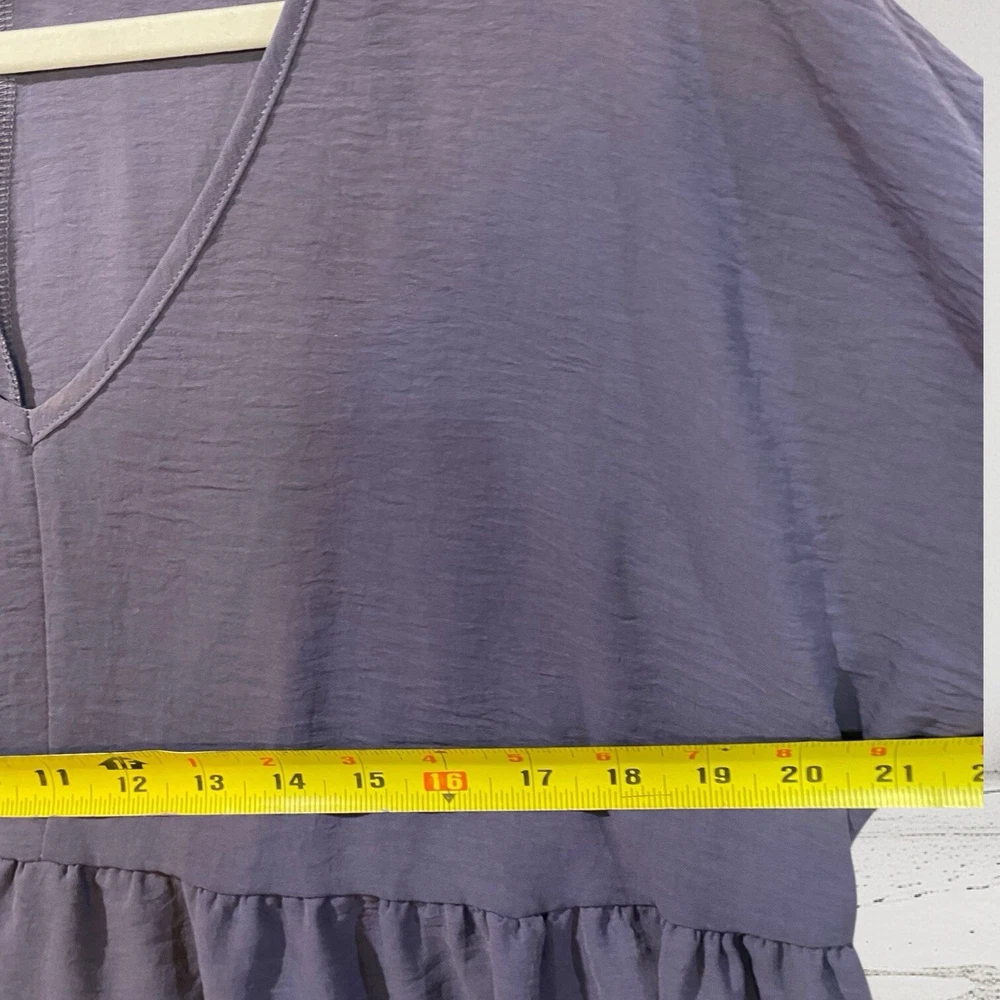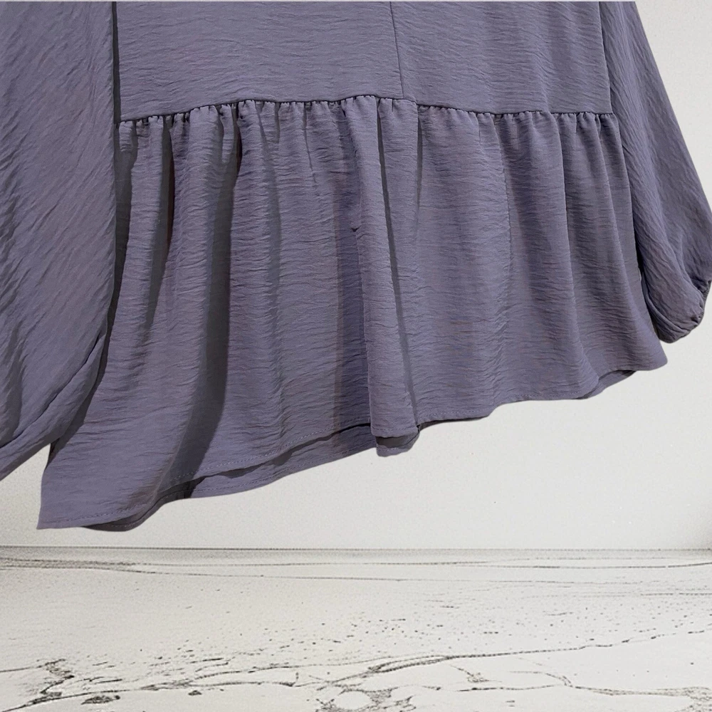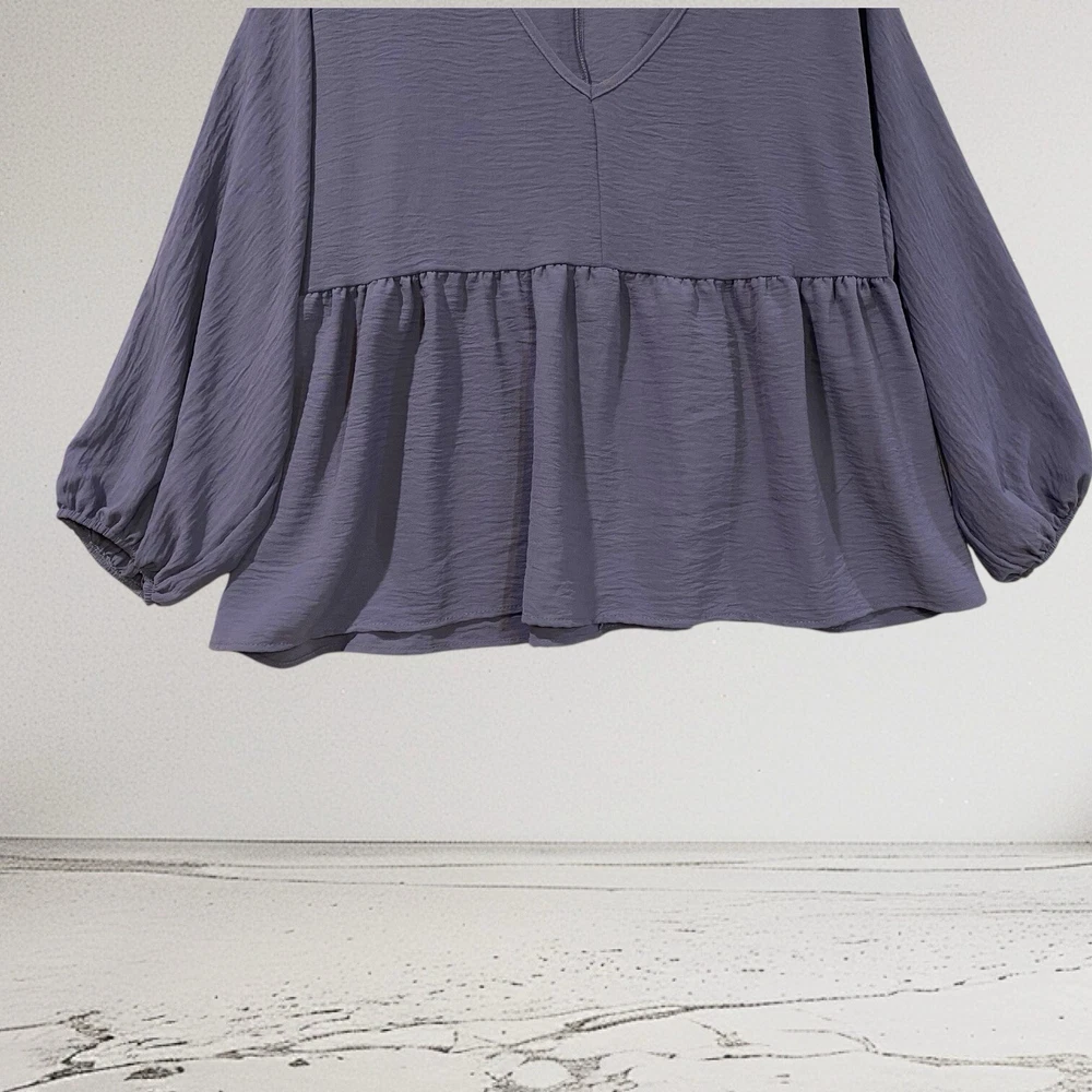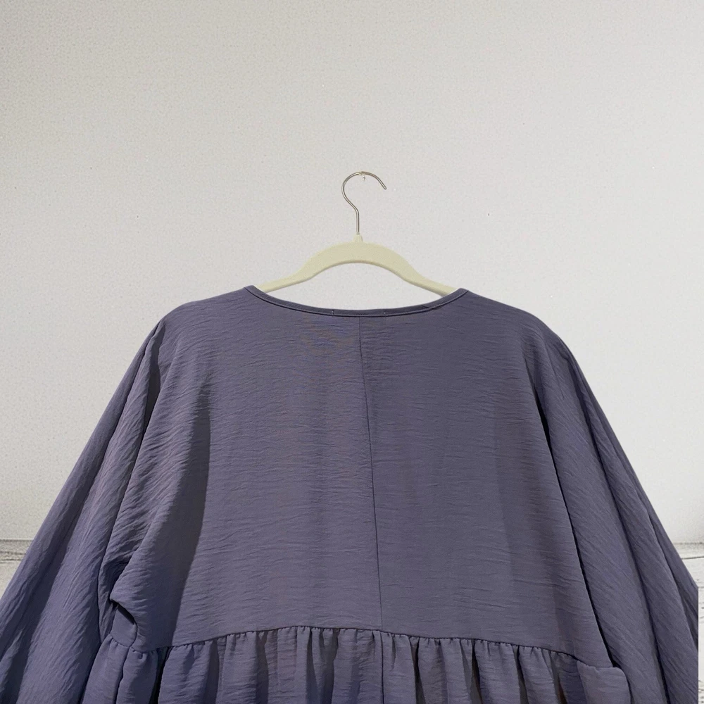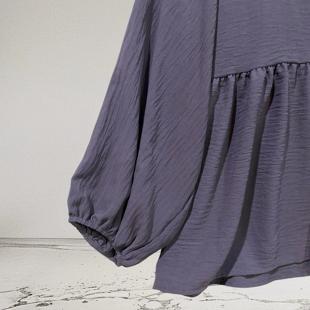 Accents: Pleated, Textured Sleeve Type: Balloon Sleeve Pattern: Solid Neckline: V-Neck Country of Origin: United States Features: All Seasons, Oversized Material: Polyester Department: Women Theme: Bohemian, Boho Chic, Babydoll Tops, Y2K, Casual Chic Size: S Type: Blouse Closure: Pullover Color: Purple / Blue Size Type: Regular Style: Basic Brand: Entro Sleeve Length: 3/4 Sleeve Fit: Relaxed