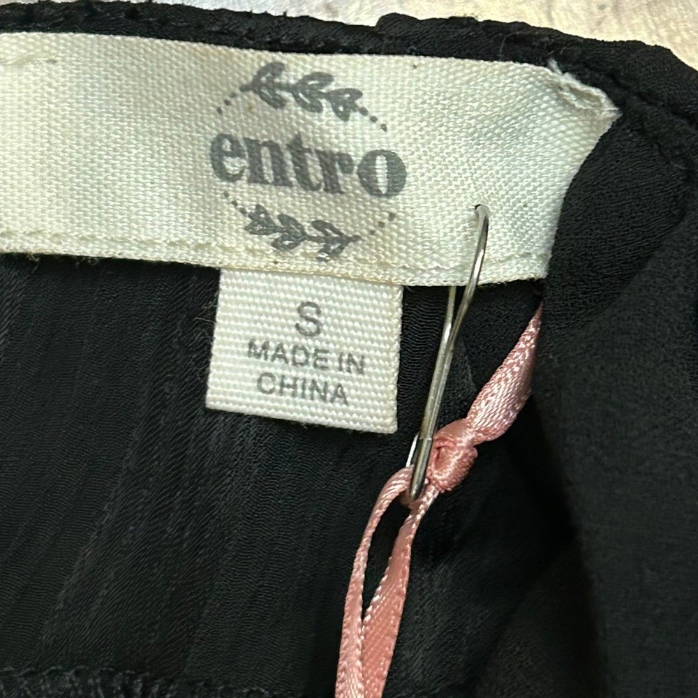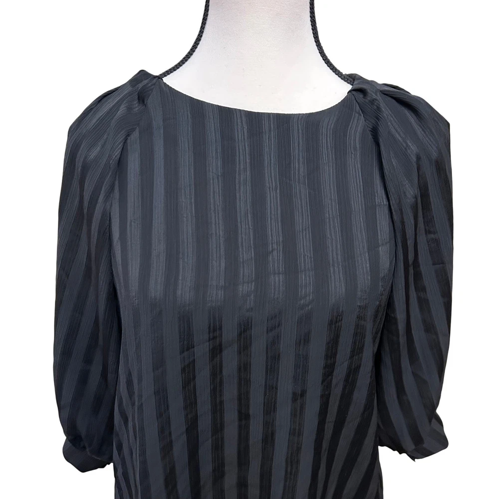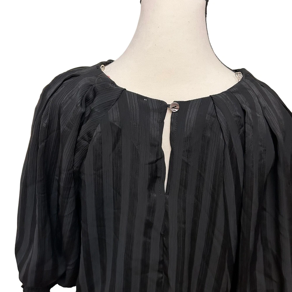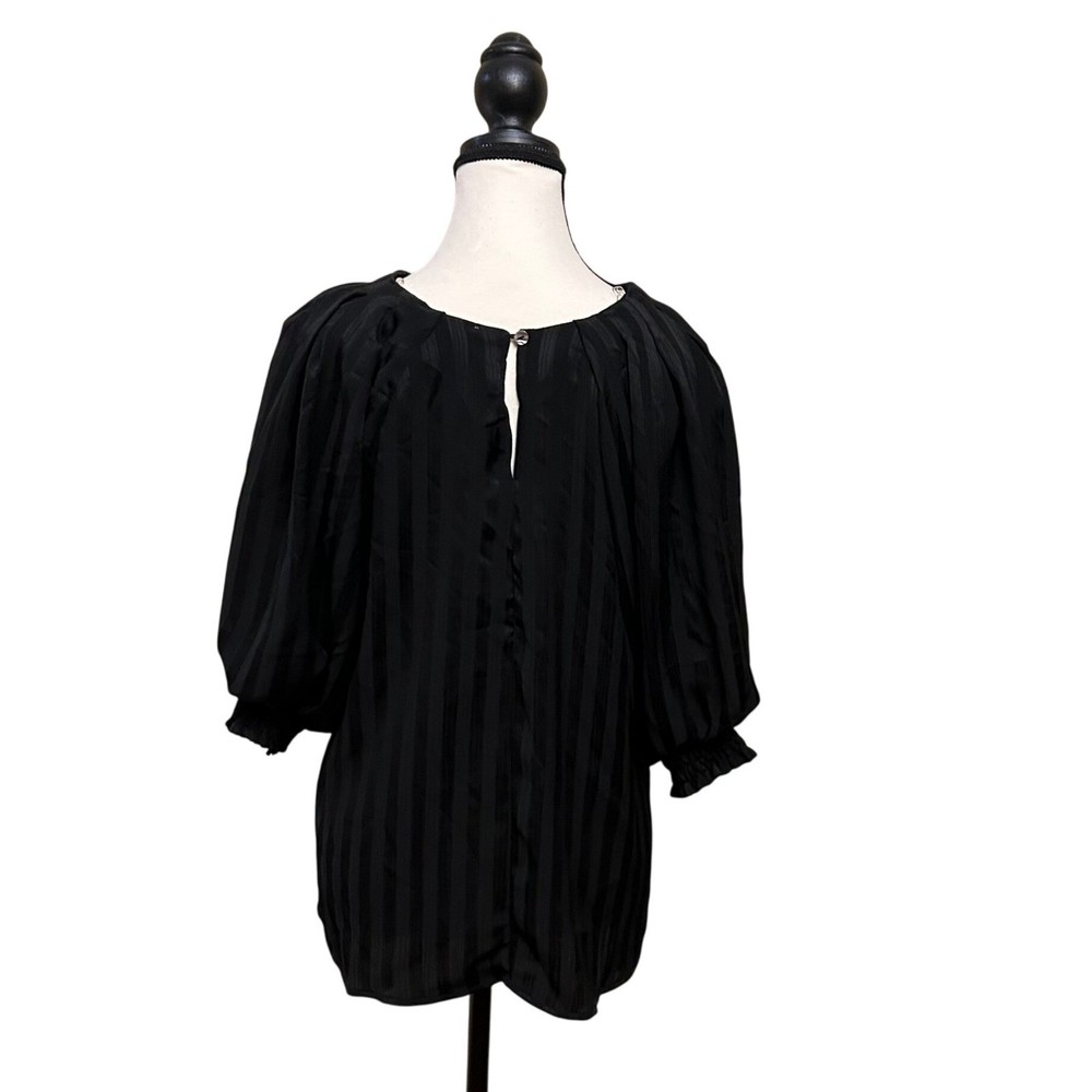 Elevated style exudes from this sophisticated black blouse. Vertical stripes add a touch of dimension, while the elegant puff sleeves create a flattering silhouette. A single button at the back adds a subtle closure detail. This chic top is perfect for making a statement at the office, looking polished on a casual date, or adding a touch of refinement to a weekend brunch outfit. Measurements: • Pit to pit: 18 inches • Length: 22.5 inches Color: Black Type: Blouse Department: Women Material: Polyester Neckline: Round Neck Sleeve Length: 3/4 Sleeve Sleeve Type: Puff Sleeve Accents: Button Pattern: Striped Features: Lightweight, Breathable, Easy Care Fit: Regular Keywords: black blouse, striped top, puff sleeve blouse, womens top, size S, entro, career blouse, casual top, dressy blouse, blouse, top, womens fashion, business casual, going out top