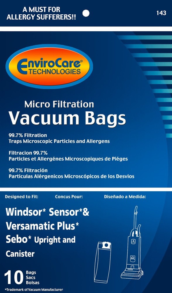 10 Replacement Micro Filtration Vacuum Cleaner Dust Bags designed to fit: Windsor Versamatic, Javelin 14/18, Archer/Tornado Models: CW50 & CW100, SSS Presence II Designed to Fit: Windsor sensor, Windsor Versamatic Plus, Sebo automatic, Sebo, Sears Kenmore Pro, AllStar Javelin, Century 400 U Vac, Triple S/SSS Designed to Fit Models: SR12, SR 12, SR-12, SR15, SR 15, SR-15, SR16, SR 16, SR-16, SR17, SR 17, SR-17, SR18, SR 18, SR-18, Sensor XP12, VSP14, VSP 14, VSP-14, VSP18, VSP 18, VSP-18, X1, X4, X5, XP2, XP-2, XP 2, BS 36, BS36, BS-36, 370 electronic, Professional G1, G 1, G-1, C, K, C2,C3, K2, K3, X, G & C Series, 12 & 15 upright series, (with locking green clip), 12 series, (with locking green clip), Prosense II Fits with or replaces genuine original (OEM): Windsor Sensor , Versamatic Plus and SSS Prosense #8600500 (previously 5300) Sebo manufacture bag # X/C/370, Part # 5093AM, Century 400 U Vac, Sears Kenmore Professional Upright Vacuum # 20-50015, 50015 Plastic mount on bag (Original Windsor Sensor is green) Electrostatically charged 3 layer microfiltration liner with 99.7% filtration Designed and developed in the USA, manufactured by - an American owned family business and the global leader in premium aftermarket vacuum bags and filters
