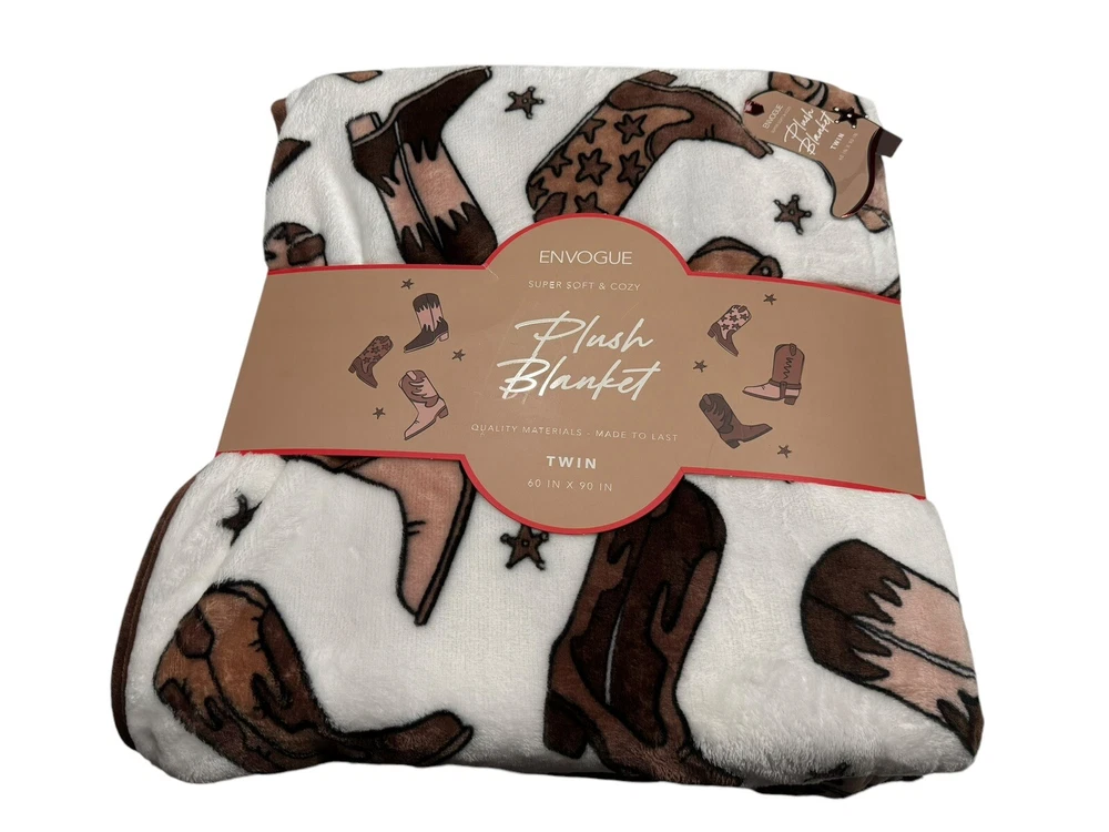 Envogue 60" X 90” TWIN Cowboy Boots THROW Blanket Soft & Cozy Condition: New with tags. Snuggle up with this soft and cozy Envogue throw blanket featuring a solid white color and a charming cowboy/cowgirl boot design. Measuring 60 inches by 90 inches, this twin-sized blanket is perfect for adding a touch of Western style to your bedroom decor. Made from high-quality polyester material, this throw blanket is durable and easy to maintain. Whether you're lounging around the house or adding an extra layer of warmth to your bedding, this throw blanket is a must-have for any cowboy or Western enthusiast.