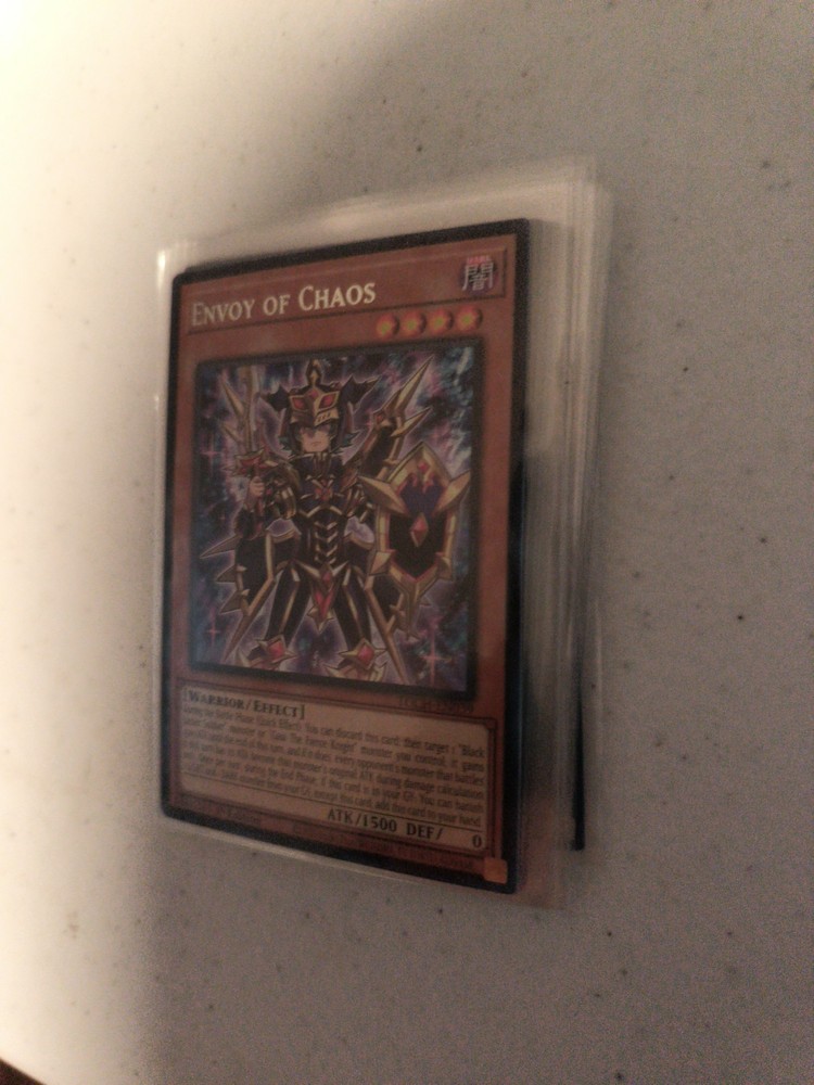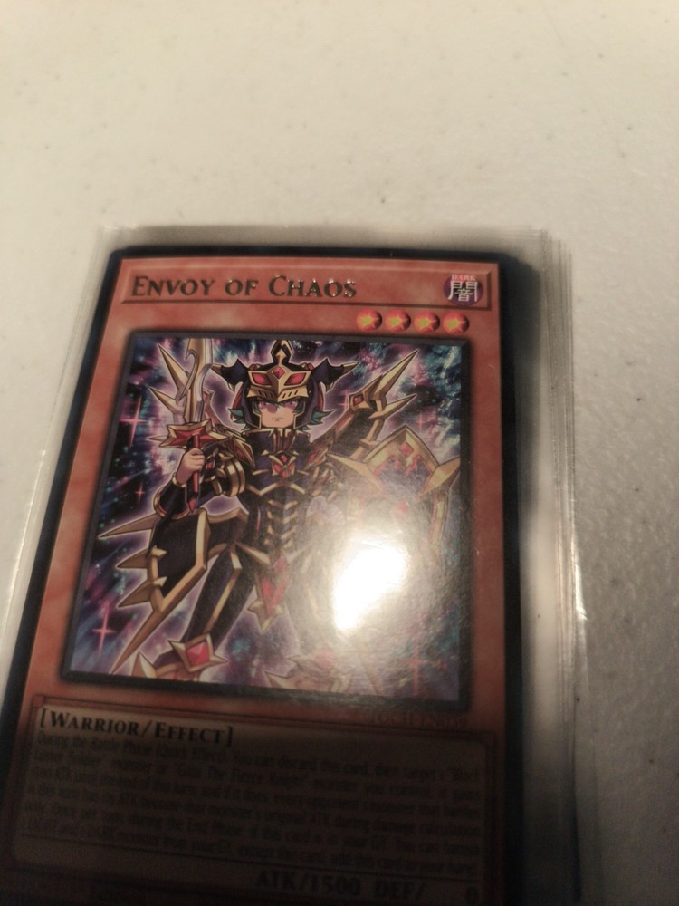 Level:4Language:EnglishFeatures:1st EditionGame:Yu-Gi-Oh! TCGAdditional Description:Envoy of ChaosCreature/Monster Type:Warriorbrand:KonamiCard Number:TOCH-EN039Card Name:Envoy of ChaosRarity:RareAttack/Power:1500Set:Toon ChaosAttribute/MTG:Color:DarkManufacturer:KonamiCard Type:EffectCard Text:During the Battle Phase (Quick Effect): You can discard this card, then target 1 "Black Luster Soldier" monster or "Gaia The Fierce Knight" monster you control; it gains 1500 ATK until the end of this turn, and if it does, every opponent's monster that battles it this turn has its ATK become that monster's original ATK during damage calculation only. Once per turn, during the End Phase, if this card is in the GY: You can banish 1 LIGHT and 1 DARK monster from your GY, except this card; add this card to your hand.Defense/Toughness:0