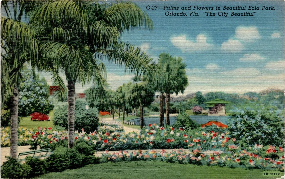 MAKE AN OFFER. THE MORE YOU BUY THE BETTER DEAL I WILL ACCEPT The postcard depicts Palms and Flowers in Beautiful Eola Park in Orlando, Florida, known as The City Beautiful. The park is famous for its stunning array of flowers, which are described as too beautiful for words. The postcard was produced by the Orange News Co. in Orlando. The image is a genuine Curteich-Chicago C.T.
