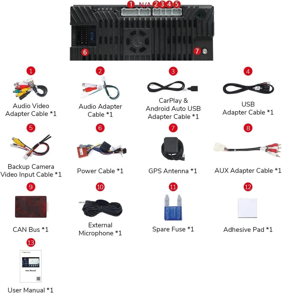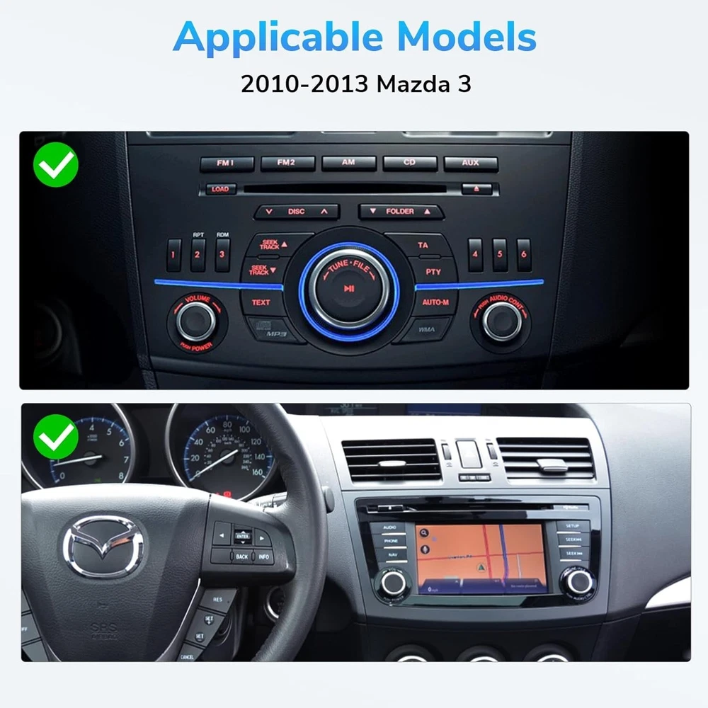 Menu Language: English/Spanish/French/German and other 80 languages Bundle Description: Head Unit M3BLA13 with accessories included Brand Type: Aftermarket Branded Navigation: Built-in GPS module and external GPS Antenna Type: In Dash Smart Android Car Stereo GPS Navigation Screen Size: 9in. Bluetooth: Support hands free,MP3 player,Phonebook,OBD2 Custom Bundle: No Compatible Vehicle Make: Mazda UI Themes: 3 Sets Support app installation: Yes CPU: Quad Core, RAM 2GB, ROM 32GB Features1: Voice Control, Built-in WiFi, Built-in Hard Disk, Fast Boot UPC: Does not apply Features: Android Radio, Auxiliary Input, Bluetooth Ready, Voice-Activated Command, MP3 Player, Steering Wheel Control, Touchscreen, USB Input, Equalizer, Smartphone Charging Screen Display: IPS Display Built-in Apple CarPlay and Android auto: Yes, Wired & Wireless both supported Operating System: Android 13 System Personalized Options: Changeable Wallpapers & Button colors Brand: Eonon Screen Mirroring: Support Compatible Vehicle Model: 3, 3 Sport, Mazdaspeed, GS-SKY, GT, GX, Sport GS, Sport GT, Sport GX, i, S, Touring, Sedan, Hatchback, Mazda3, 2010 2011 2012 2013 Support Software Updates: Yes Color: Black Support: OBD2, DVR, 4G, 3G, Backup camera gtin13: Does not apply A13-Series Function Guide: www.youtube.com/playlist?list=PLatCedgKfKVM0qkbsU1RpQFcQl_1Qlee7 Universal Fitment: No Sirius XM radio: Can download Sirius XM radio app to use online Fitment Type: Direct Replacement Placement on Vehicle: Front USB Port: 3*USB ports Microphone: Built-in internal microphone, external microphone incl. Multi-Color Button Light: Supported MPN: M3BLA13 Built-in Radio: Yes, FM/AM radio with RDS AUX Input: Support Unit Size: 2 DIN Steering Wheel Control: Support(CANBus System), CANBus included