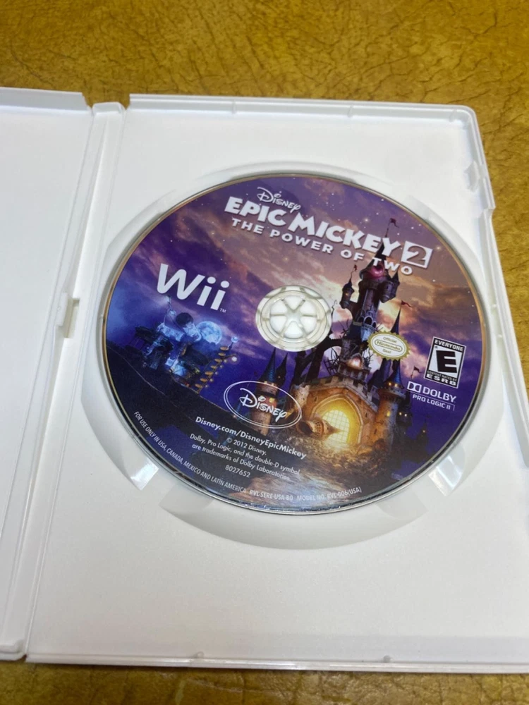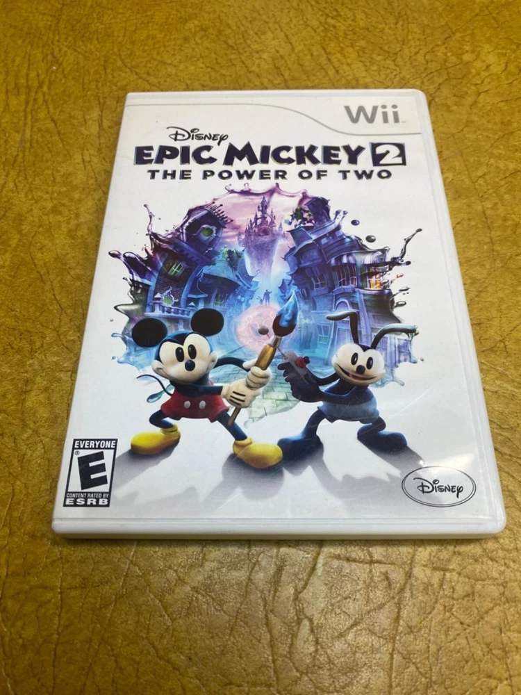 The product is a video game titled "Epic Mickey 2: The Power of Two" designed for the Nintendo Wii platform. It is rated E for Everyone, indicating it is suitable for all ages. The game is published by Disney Software, known for creating family-friendly entertainment. "Epic Mickey 2: The Power of Two" likely follows the adventures of Mickey Mouse in a whimsical and interactive world, offering players the opportunity to engage in a variety of fun and challenging gameplay experiences on the Wii console. Includes: Item and Box only Condition: Normal wear Description: No manual, comes with a protective sleeve.