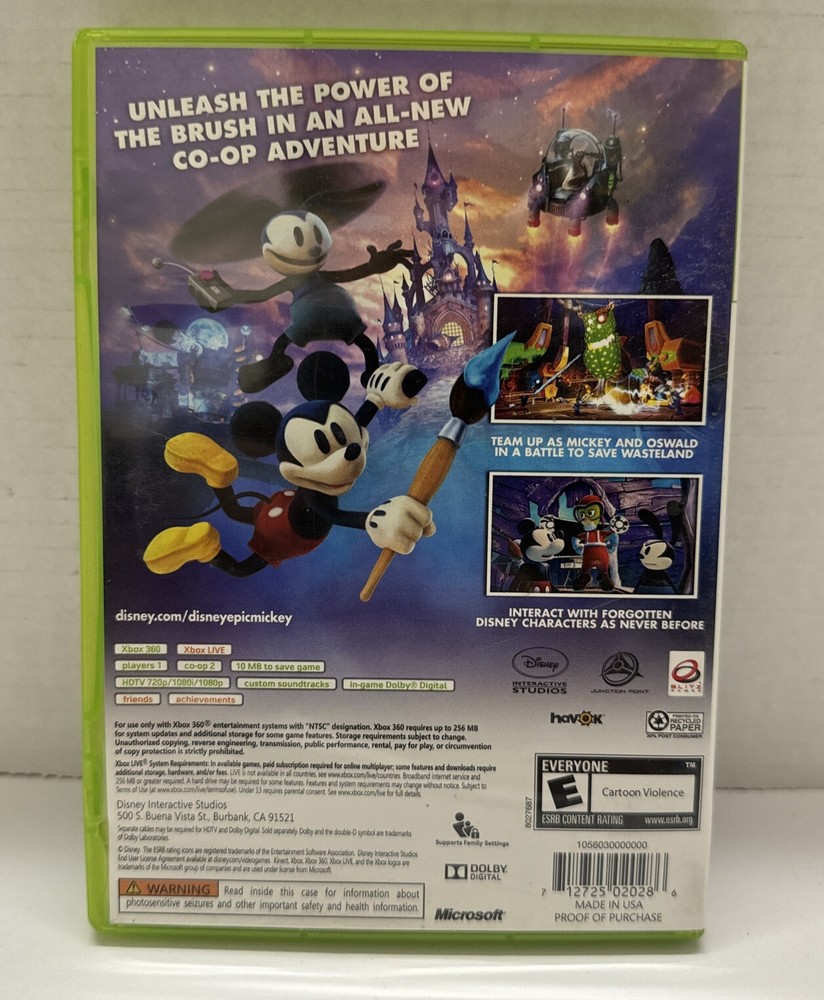gtin13:0712725020286Features:Complete Edition, Manual Included, Multiplayer, Co-Op, Tested, Fast ShippingPublisher:Disney InteractiveRelease Year:2012MPN:712725020286Manufacturer Warranty:NONE USEDRegion Code:NTSC-U/C (US/Canada)Platform:Microsoft Xbox 360Country/Region of Manufacture:United StatesGame Name:Disney Epic Mickey 2: The Power of TwoUPC:0712725020286Sub-Genre:Not ApplicableGood Deal:VeryGenre:Action & AdventureRating:E-EveryoneVideo Game Series:Epic Mickey