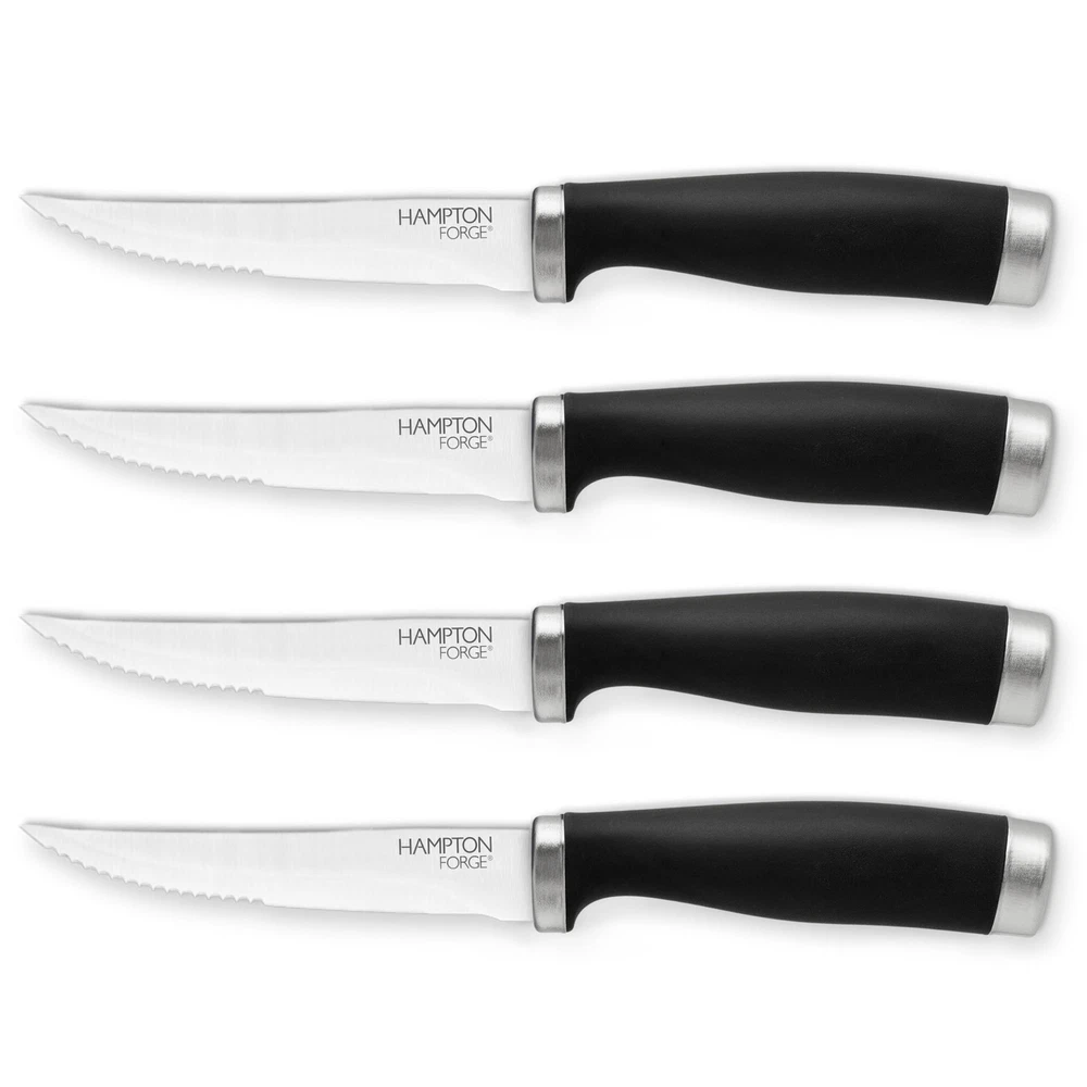 With a chic soft-grip, black handle, the Epicure 4 Piece Steak Set by provides the balance and ergonomics needed to cut efficiently. Featuring a timeless design with exceptionally sharp stainless steel, serrated blades, polished to a mirror finish. Epicure will provide reliable dining year after year, and looks great in a casual or formal dining setting. HOLLOW-GROUND SERRATED EDGE – Factory ground to a precision edge for clean cuts; crafted from very high quality stainless steel that resists corrosion, rusting and pitting. SOFT GRIP HANDLE – Ergonomically designed offering comfortable, safe and slip-resistant cutting. UPGRADE YOUR CUTLERY – For a twist on the traditional, the Epicure Steak Set offers a bit of contemporary flair to place setting. Hand wash Recommended Set Includes: (4) 4.5" Steak Knives