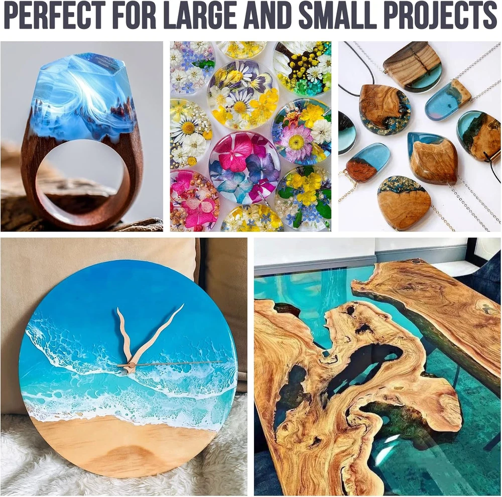 💎 [EASY TO USE AND FAST CURING] Simply mix the resin and curing agent in a 1:1 volume ratio to start using. It has a 45 minute working time, making it perfect for beginners and allows time to mix bright colors for eye-catching creations. The easy to pour epoxy resin formula can self level and smooth. It will quickly solidify within 8-24 hours; Even if you haven't been exposed to it before, you can start quickly. 💎 [SELF DEFOAMING] Our formula adds defoamer, which automatically releases trapped bubbles and has strong defoaming ability. It is recommended that each layer should not exceed 1/4 inch, which can be quickly and completely eliminated. To achieve perfect surface treatment in cold weather: preheat the resin and hardener before use. Our epoxy resin kit is safe, reliable, and non flammable. 💎 [ULTRA HIGH GLOSS CRYSTAL TRANSPARENT EPOXY RESIN] Professional grade transparent epoxy resin and hardener are a perfect formula that can make your art vibrant, long-lasting, scratch resistant, moisture-resistant, rock hard, and have a glass like surface treatment, long-lasting, ultra transparent appearance, and will not turn yellow. 💎 [SUITABLE FOR BEGINNERS & PROS] Resin set including 8 oz resin, 8 oz hardener, comes with a detailed instruction, which introduces common problems and solutions in resin production. Beginners can conduct a small amount of testing before work. 💎 [WIDELY USED] Our resin is suitable for various DIY process projects, such as making jewelry, coasters, wooden furniture, tabletops, countertops, paints, etc. It fits perfectly with the silicone mold and will not cause the mold to tear. Don't limit your imagination, create works that you enjoy. If there are any issues (leakage, loss, usage issues), please feel free to and we will provide a replacement or refund guarantee. Product Description MEASURE 1:1 BY VOLUME Measure 1:1 ratio (by volume、Not weight),then pour clear epoxy resin together into a container. STIR IN THE SAME DIRECTION Stir slowly art resin in one direction until no swirls are seen at all. Scrape the sides and bottom thoroughly.Ensure uniform mixing at all positions. POUR PIGMENT OR SEQUINS Stir thoroughly until the color is even in the resin, and quickly pour art resin into model. POUR RESIN IN MODEL The thin the resin, the better self equal effect.You have up to 45 minutes to complete your project and DIY to achieve your creativity. MOLD FRIENDLY,QUICK CURING Mild heat dissipation without damaging the mold;The resin dries after 8 hours, solidifies after 24 hours, and reaches full hardness after 72 hours. LET'S MAKE GREAT WORKS OF ART TOGETHER FUHITIM epoxy resin is suitable for making small jewelry and coasters; It is also suitable for creating large-scale artworks such as riverbed tabletops, coatings, and casting; Hurry up and create your own unique artwork! Package Of Epoxy Resin Kit 8 oz Resin 8 oz Hardener, 2 100ml Measuring Cups 2 50ml Measuring Cups 5 Wooden Stirrers 2 Pair of Gloves Detailed Manual What You Get From FUHITIM Crystal Clear Epoxy Resin Kit? Clear and Self Leveling Our casting resin is easy to Self-leveling, high-glossy, no yellowing, No Bubbles,which will remain clear all the time. Premium Quality Professional team research and development,our customized epoxy clear is made with premium quality, being 100% safe for use and low odor! Multi-Purpose and Fits for All People Suitable for beginners and artists, Can be used for multiple purposes such as DIY resin art, jewelry making,crystal clear coating, casting ,tabletop and more. KIND REMINDER A:B=1:1 by volume : Double check the proper 1:1 by volume mix ratio was used. esin and hardener : Make sure you used resin and hardener and not all resin or all hardener. ully mixed : Upon mixing, be sure to scrape sides and bottom of mixing container to ensure all resin and hardener are fully blended. Failing to do so can result in soft spots in coating. Pouring : Never scrape or brush the sides or bottom of the container you just mixed. There will always be an unmixed portion which can be dislodged and will leave a wet or sticky spot on your coating. Temperature : If the temperature drops below 60 ° F during the initial curing of epoxy resin, it may affect the self-leveling and curing time of epoxy resin; If the temperature is too low, it is recommended to increase the temperature of the epoxy resin and the surrounding environment to 80 ° F+. The resin dries : The resin dries after 8 hours, solidifies after 24 hours, and reaches full hardness after 72 hours.