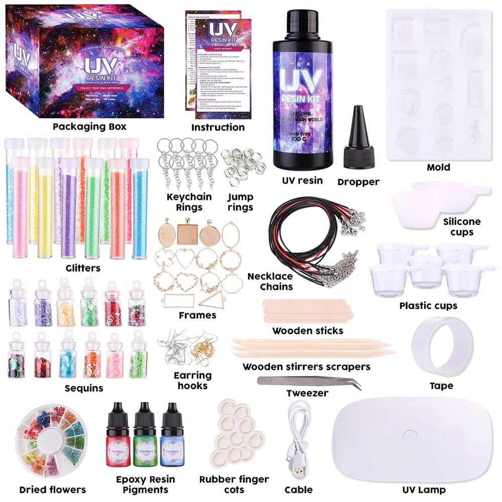 Perfect kit for beginners with easy instructions to make jewelry like bracelets, necklaces, and keychains Comes with UV lamp, resin, molds, colors, tools like tweezers, chains, and 14 frames with tape for easy crafting Non-materials create crystal clear, durable resin jewelry and crafts Wide application for home decor, gifts, and custom jewelry pieces 30-day money back and ideal gift for resin craft lovers