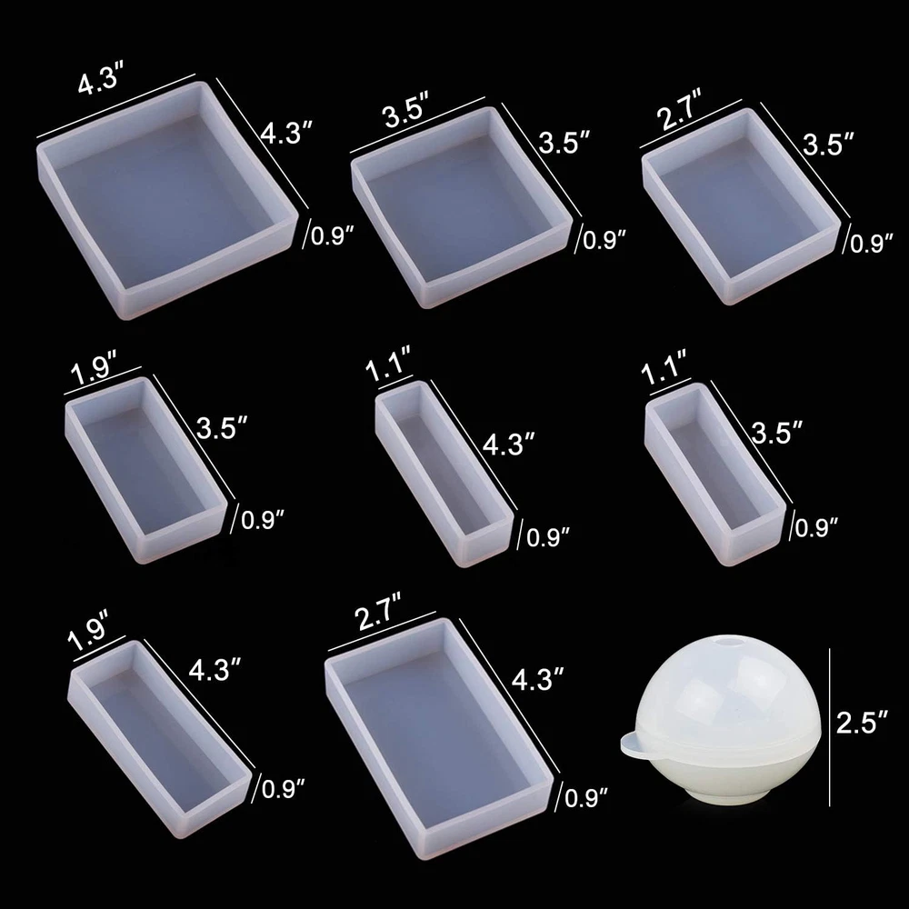 Store New Arrivals Add to Favorite View Feedback Contact Fast deliveries to the customer's home Quality customer service John Make the customers happy! Epoxy Resin Molds, Resin Casting Molds Silicone Square Ball Molds 9PCS Different Sizes, Silicone Resin Molds for Resin Jewelry, Soap, Dried Flower Leaf, DIY Fans Description Premium Quality Silicone Material: The square rectangular ball silicone molds are made of silicone with advanced technology, flexible and durable, reusable and high transparency, and easy to use and clean. This silicone mold kit has a total of 9pcs, 6 pcs rectangular silicone molds in 6 sizes, 2 pcs silicone casting square epoxy resin molds, and 1 pc sphere resin mold. Strong Compatibility: These resin silicone molds are compatible with many casting materials, especially for epoxy resin, casting resin, not for coating resin; add some resin pigments, resin dyes, and embed different kinds of decorations or fillers; and with the following casting materials such as gypsum, wax, soap, polymer clay, gypsum, etc. Easy to Demold: These casting resin molds are with smooth and shiny interiors, they can be easily popped out of the silicone molds once the finished works are fully cured. Wide Application: Ideal for making specimens, coasters, paperweights, soap dishes, wall decor, bowl mats, home decor, and more. You can also share more time with your family and create unique dried flower, leaf, and insect specimens and other resin jewelry projects with loved ones, friends, or kids. Quality Service: LET'S RESIN attaches great importance to consumer experience and will continue to update and optimize products. If you encounter any problems when using LET'S RESIN products, please contact us in time. We will provide good service to ensure your shopping experience. Product Description Smooth Mirror Like Surface The surface of craftwork will be high transparency, scratch-free, no need to polish. Wide Application Great for making specimen, coasters, paperweights, soap dishes, wall decoration, bowl mat, home decoration, etc. Easy To De-Mold You just need to twist the mold and release your creation after the resin is completely cured. Flexible Silicone Soft silicone material with excellent elasticity, can withstand temperature from minus 40 to 446 degrees Fahrenheit. More Exquisite Molds Options Add to Cart Add to Cart Add to Cart Add to Cart Customer Reviews 4.6 out of 5 stars 597 4.5 out of 5 stars 997 4.6 out of 5 stars 3,824 4.6 out of 5 stars 693 4.4 out of 5 stars 556 Price — $14.99 $ 14 . 99 $14.99 $ 14 . 99 $8.99 $ 8 . 99 $19.99 $ 19 . 99 Material Sturdy Silicone Sturdy Silicone Sturdy Silicone Sturdy Silicone Sturdy Silicone Surface Smooth Interior Smooth Interior Mirror Like Surface Mirror Like Surface Mirror Like Surface Easy to Demold ✔ ✔ ✔ ✔ ✔ Not Easy to Deform ✔ ✔ ✔ ✔ ✔ Easy to Clean ✔ ✔ ✔ ✔ ✔ Item model number E4-BBMJ-K Color Rectangle Molds Material Silicone Item Weight 1.06 pounds Shape Square Is Discontinued By Manufacturer No Package Dimensions 9.13 x 6.42 x 1.93 inches Number of Pieces 9 ABOUT US We offer the best prices around on high quality products. Our E-store includes media such as books, movies, music and games while offering electronics, toys, sporting apparel, clothing, tools, general home, garden items and more. SHIPPING We are always working hard to ensure your package arrives as soon as possible. Please understand that some factors like weather, high postal traffic, and the performance of shipping companies are outside of our control. We offer free shipping to the lower 48 states and ship within 2 business days of payment, usually sooner. We do not accept P.O. Boxes. Please provide a physical address. For shipping outside of the continental USA, we only use eBay's Global Shipping Program. The item is shipped to KY and then sent to the rest of the world. International customers are responsible for all duties and taxes. Continue to 'check out' to calculate costs for shipping the item to your country. Messages regarding eBay's Global Shipping Program MUST be directed at eBay EXCLUSIVELY. RETURNS We offer a 30-Day Return Policy on items in which you are not completely satisfied with. You have the option of a full-refund or an exchange of the item. No returns are available on items shipped outside of the USA PAYMENT We accept PayPal. CONTACT US This page content is yet to come Please ad us to your favorite seller and visit again later Thank You CUSTOMER SATISFACTION We try our very best to make sure every customer is completely satisfied. If there's a problem, message us! We're happy to help. WE ACCEPT