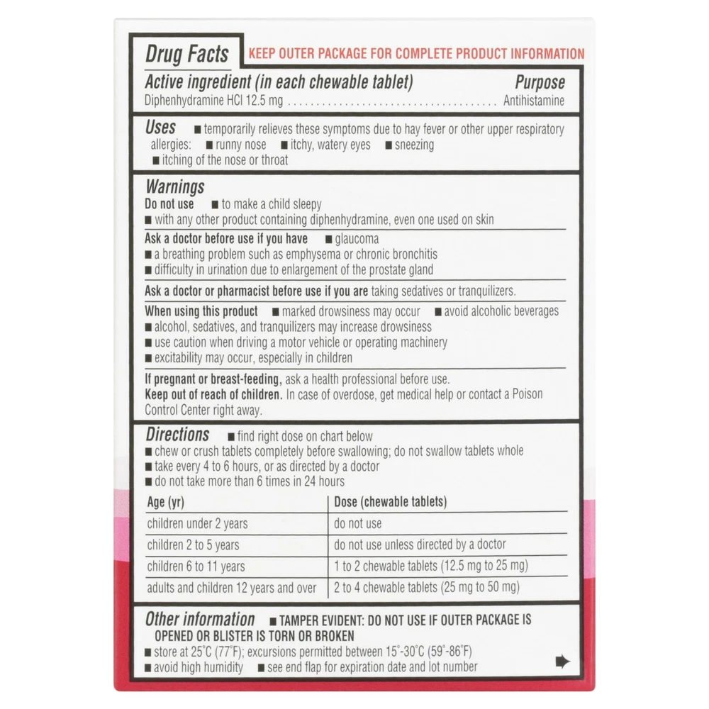 Help your child get rid of sneezing; scratchy throat; and itchy, watery eyes with Equate Children's Cherry Flavored Allergy Relief Chewable Tablets. Whether your little ones suffer from seasonal allergies or are experiencing a mild allergic reaction, our allergy relief chewable tablets alleviate symptoms and help them get back to their day. Our formula contains the active ingredient diphenhydramine HCI, an antihistamine that works to prevent the effects of histamine in the body. The suggested dose is 1-2 chewable tablets for children 6-11 years of age and 2-4 tablets for children ages 12 and older every four to six hours. Do not take these tablets more than six times in 24-hours. When your child starts experiencing allergy symptoms, stop reaching for more boxes of tissues and start reaching for Equate Children's Cherry Flavored Allergy Relief Chewable Tablets. Making the right health decisions can be challenging. With a complete range of products and simple solutions, Equate allows you to take care of your family with confidence. Relieves sneezing, runny nose, itchy throat, and itchy, watery eyes For children 6 years and older Diphenhydramine HCI, 12.5mg: antihistamine 20 chewable tablets Delicious cherry flavor Tamper-evident packaging Compare to Children's Benadryl Chewables active ingredient