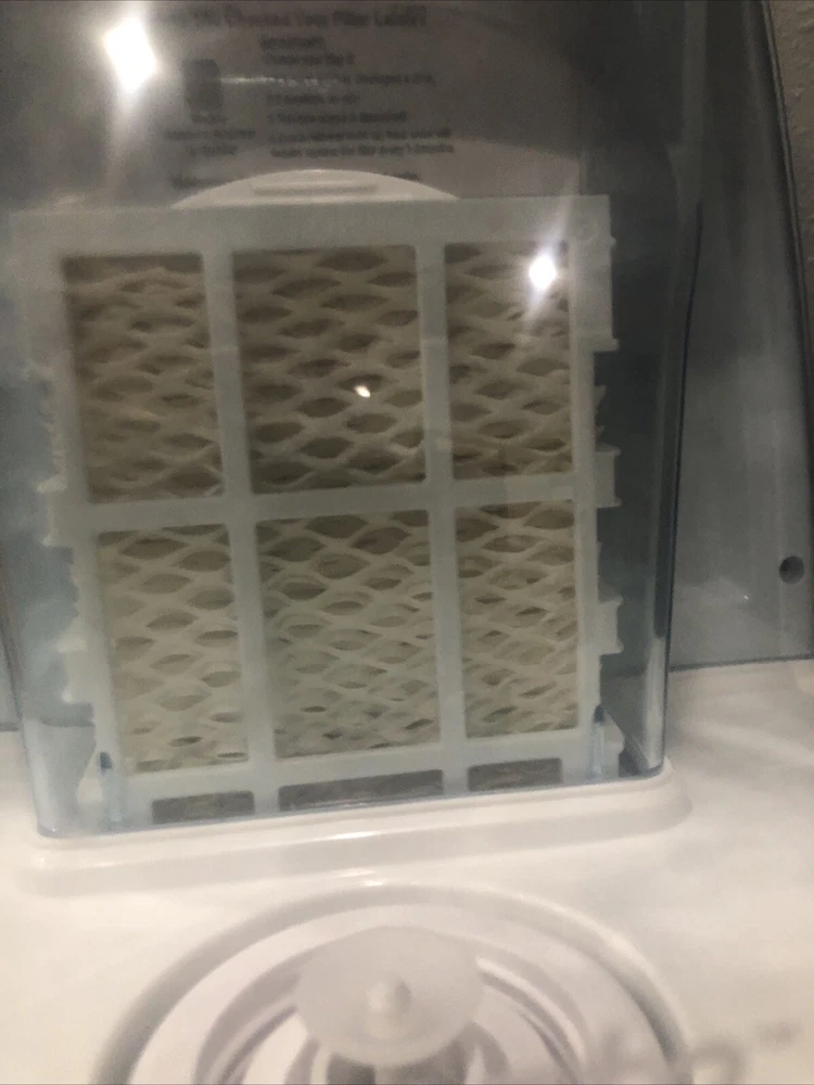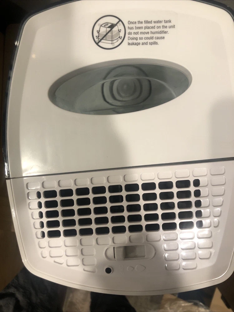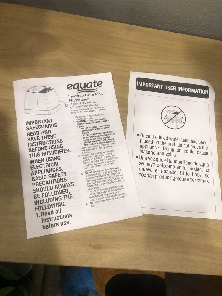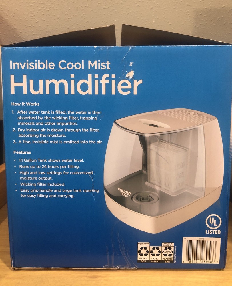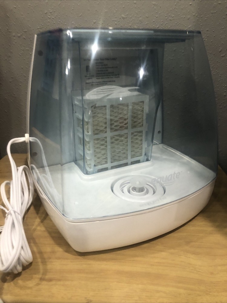Add moisture to the air with the EQUATE Invisible Cool Mist Humidifier. This humidifier uses a cool mist method to add moisture to the air, making it perfect for any room in your home. With a 1.1 gallon tank capacity, this humidifier can run for up to 24 hours, and the adjustable humidity control allows you to set the perfect level of humidity for your space. This tabletop humidifier is perfect for large rooms up to 250 square feet, and the easy grip handle on the large tank makes it easy to refill. The humidifier also features a filtered moisture outlet, ensuring that the moisture is clean and fresh. With two speed settings, this humidifier is an effective and easy-to-use addition to your home. Lightly used. All inserts inside