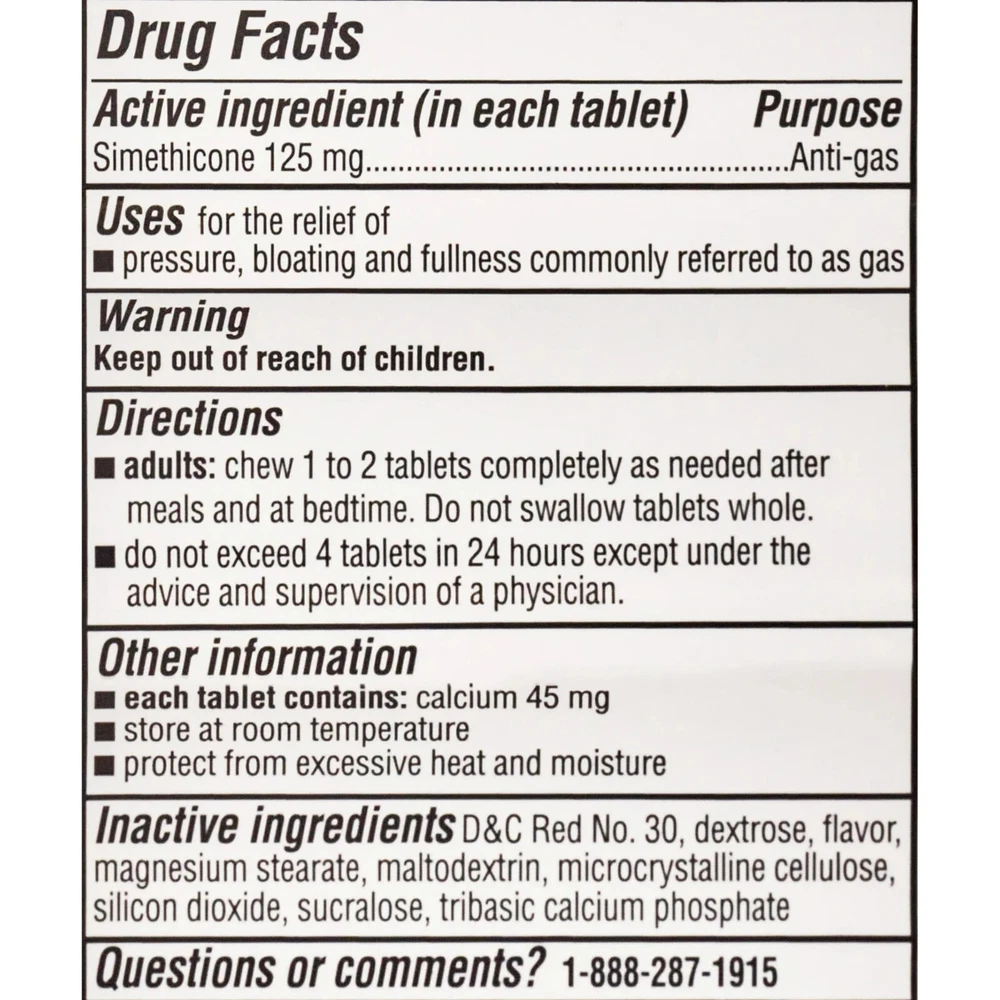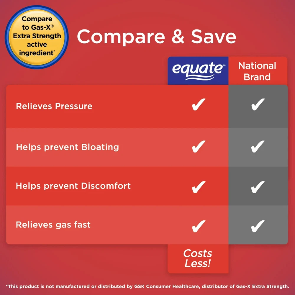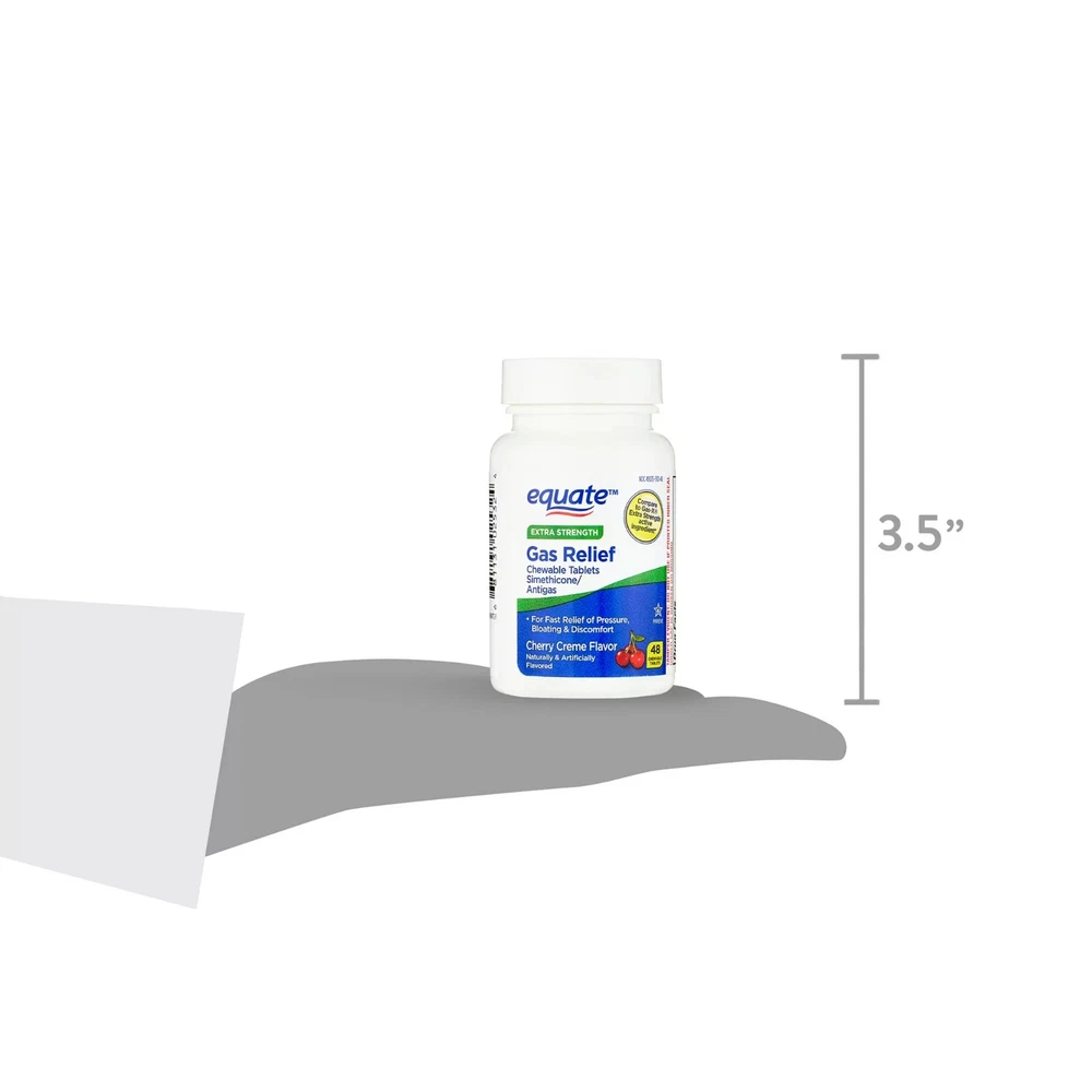 About this item Product details Equate Cherry Creme Extra Strength Gas Relief Chewable Tablets are specially formulated with simethicone to relieve gas pressure, bloating and discomfort. Gas may be caused by foods high in indigestible fiber, certain medical conditions, or a side effect of some medications. Bloating is caused by the buildup of gas in the digestive system, making you feel overly full and uncomfortable. These tablets help to break up gas bubbles in your stomach and intestines. Once the trapped gas is broken down, your body is then able to deal with it naturally. The tablets come in a chewable form with a sweet cherry creme taste, making them ideal for those with trouble swallowing pills. Let Equate Extra Strength Gas Relief Cherry Creme Chewable Tablets relieve you of gas-related discomfort. Making the right health decisions can be challenging. With a complete range of products and simple solutions, Equate allows you to take care of your family with confidence. Equate Extra Strength Gas Relief Chewable Tablets, Cherry Creme, 48 Count: Easy to take chewable tablets Sweet cherry creme taste Extra strength formula Relieves gas, bloating, and discomfort Provides immediate relief