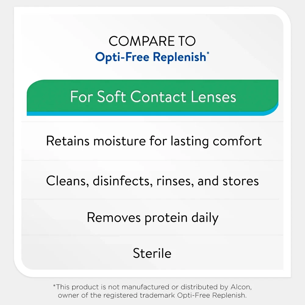 About this item Sterile multi-purpose disinfecting solution Retains moisture for lasting comfort For soft contact lenses Removes protein daily For rinsing and storage The twin pack contains (2) 12 fl oz bottles WARNINGS: Failure to discard solution from lens case after each use or use of water to care for your lenses may lead to contamination resulting in eye injury and potential loss of vision. See accompanying instructions for additional important safety information Not for use with heat disinfection If you are allergic to any ingredient in this product, do not use See inside of the carton for complete instructions and important safety information Precautions Never re-use this solution Keep the bottle tightly closed when not in use Store solution at room temperature Use before the expiration date marked on the carton and bottle Discard the remaining solution within 90 days after opening Keep out of reach of children Do not use if the imprinted neckband on the bottle is broken or missing Equate Multi-Purpose Solution Twin Pack, 12 fl oz, 2 Count