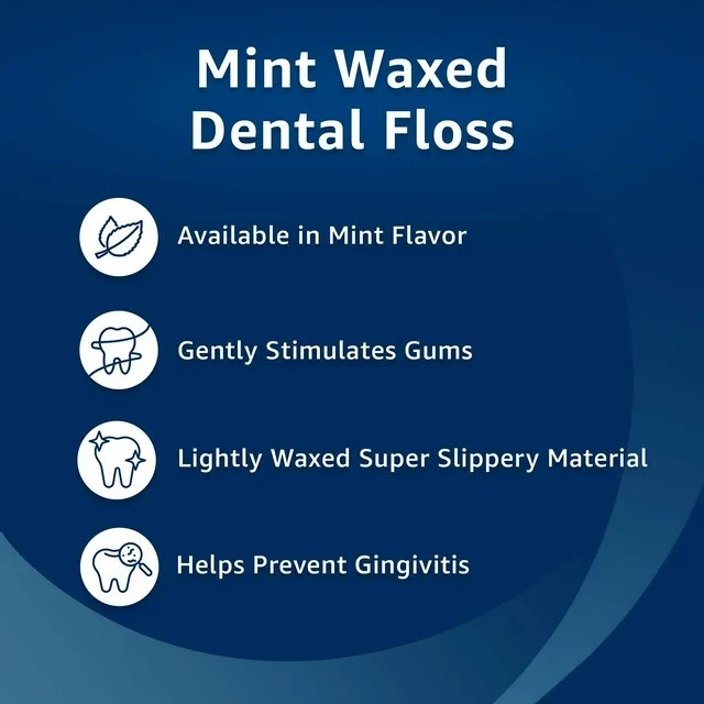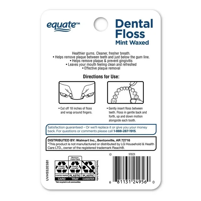 Equate Mint Waxed Dental Floss is designed to help remove plaque and leave you with cleaner, fresher breath. Equate Mint Waxed Dental Floss compares to Reach Mint Waxed Floss* and helps to prevent gingivitis and remove plaque between teeth and below the gum line. Compare to Reach Mint Waxed Floss 55 Yards Mint flavor Waxed Helps prevent gingivitis Helps remove plaque for cleaner, fresher breath