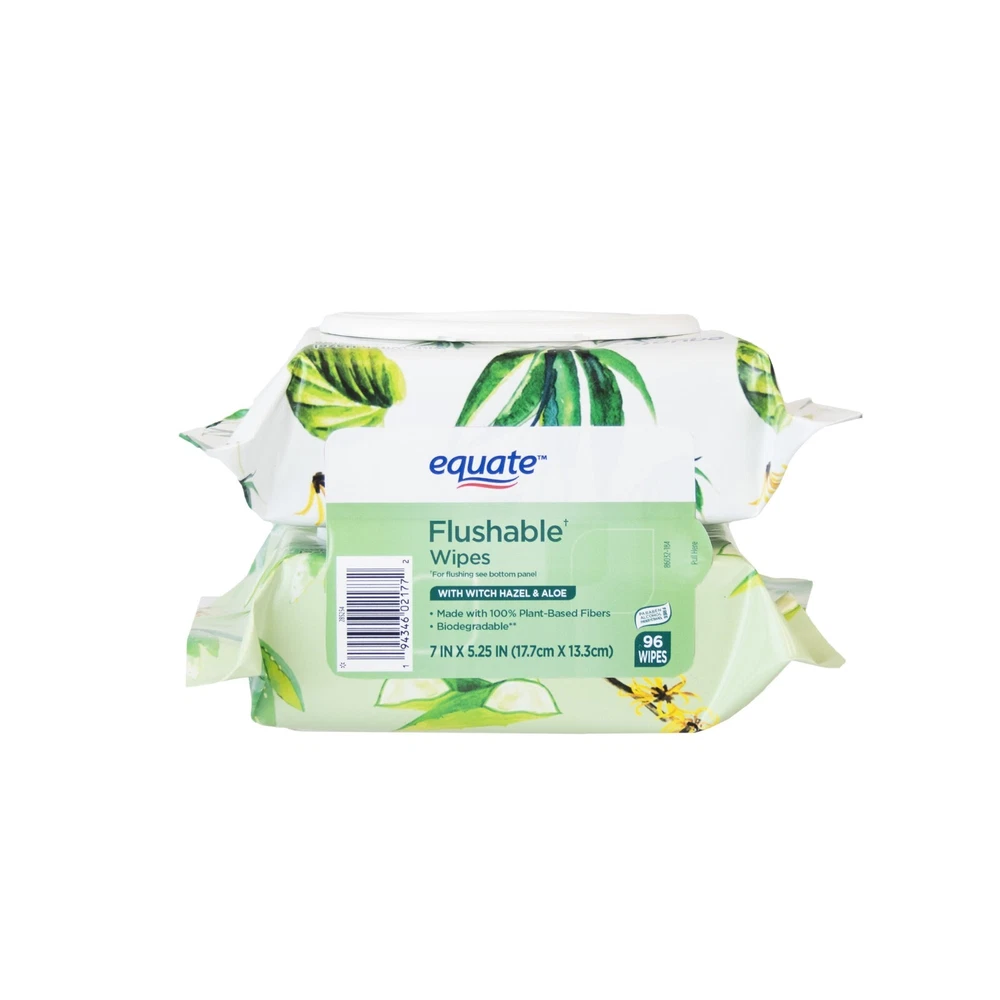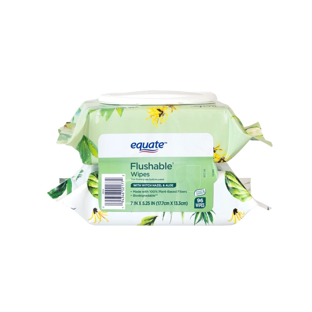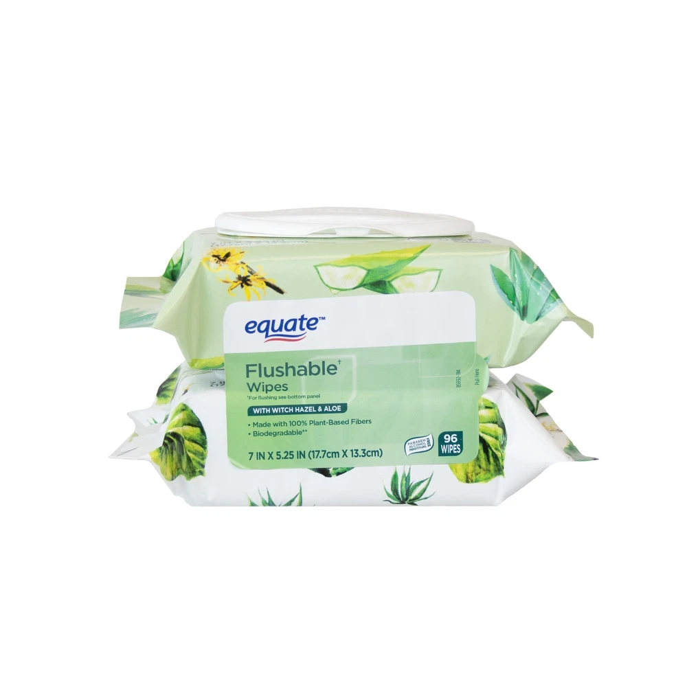 Equate Witch Hazel and Aloe Scent Flushable Wipes, 2 Flip-Top Packs (96 Total Wipes) About this item Product details Enhance your bathroom experience with Equate Witch Hazel and Aloe Scented Flushable Wet Wipes. Infused with chamomile, aloe, and vitamin E these soft wet wipes leave you feeling clean and fresh with the scent combination of Witch Hazel and Aloe. This pack contains two packages with 48 wipes each - totaling 96 wipes. The Easy Pop-Ups® Dispensing, resealable closure ensures the wipes stay moist and allows for easy access whenever you need them. Made with 100% plant-based fibers these clean quilt wipes are alcohol-free, paraben-free, dye-free, and phenoxyethanol-free with no harsh ingredients to provide a refreshingly clean experience. Making the right health decisions can be challenging. With a complete range of products and simple solutions, Equate allows you to take care of your family with confidence. Contains 2 Flip-Top Packs each containing 48 Wipes - 96 Total Flushable Wipes Witch Hazel and Aloe Scented Hypoallergenic Contains Aloe and Vitamin E Alcohol, phenoxyethanol and paraben free Great for the whole family! Easy Pop-Up Dispensing Made with 100% plant-based fibers Meets INDA flushable product guidelines (See disposal instructions) Wipes measure 7” x 5.25” Directions Instructions †Independent lab testing shows these wipes meet INDA Flushable Product Guidelines. Not all systems can accept flushable wipes. Ignoring Disposal Instructions may lead to clogs, property damage, or regulatory violations. Disposal Instructions Do not flush if: • Violates local rules • Using RV, marine, or aviation system • Using macerator toilet or household pump • Fat or grease are put in any drain or you are unsure of system capability Flushing OK if: • Permitted by local rules • One wipe per flush • No history of clogs or back ups • Septic follows EPA schedule for alternative systems (annual inspection & pumping) If a problem is noticed, dispose of in trash and stop flushing. Ingredients Inactive Ingredients Water Glycerin Cocamidopropyl PG-Dimonium Chloride Phosphate Sodium Benzoate Fragrance Citric Acid Aloe Barbadensis Leaf Extract Chamomilla Recutita (Matricaria) Flower Extract Tocopheryl Acetate Ingredients Ingredients: Water, Glycerin, Cocamidopropyl PG-Dimonium Chloride Phosphate, Sodium Benzoate, Fragrance, Citric Acid, Aloe Barbadensis Leaf Extract, Chamomilla Recutita (Matricaria) Flower Extract, Tocopheryl Acetate.
