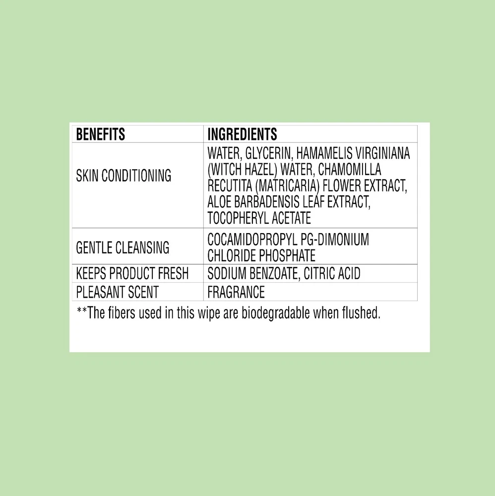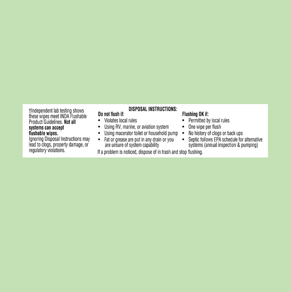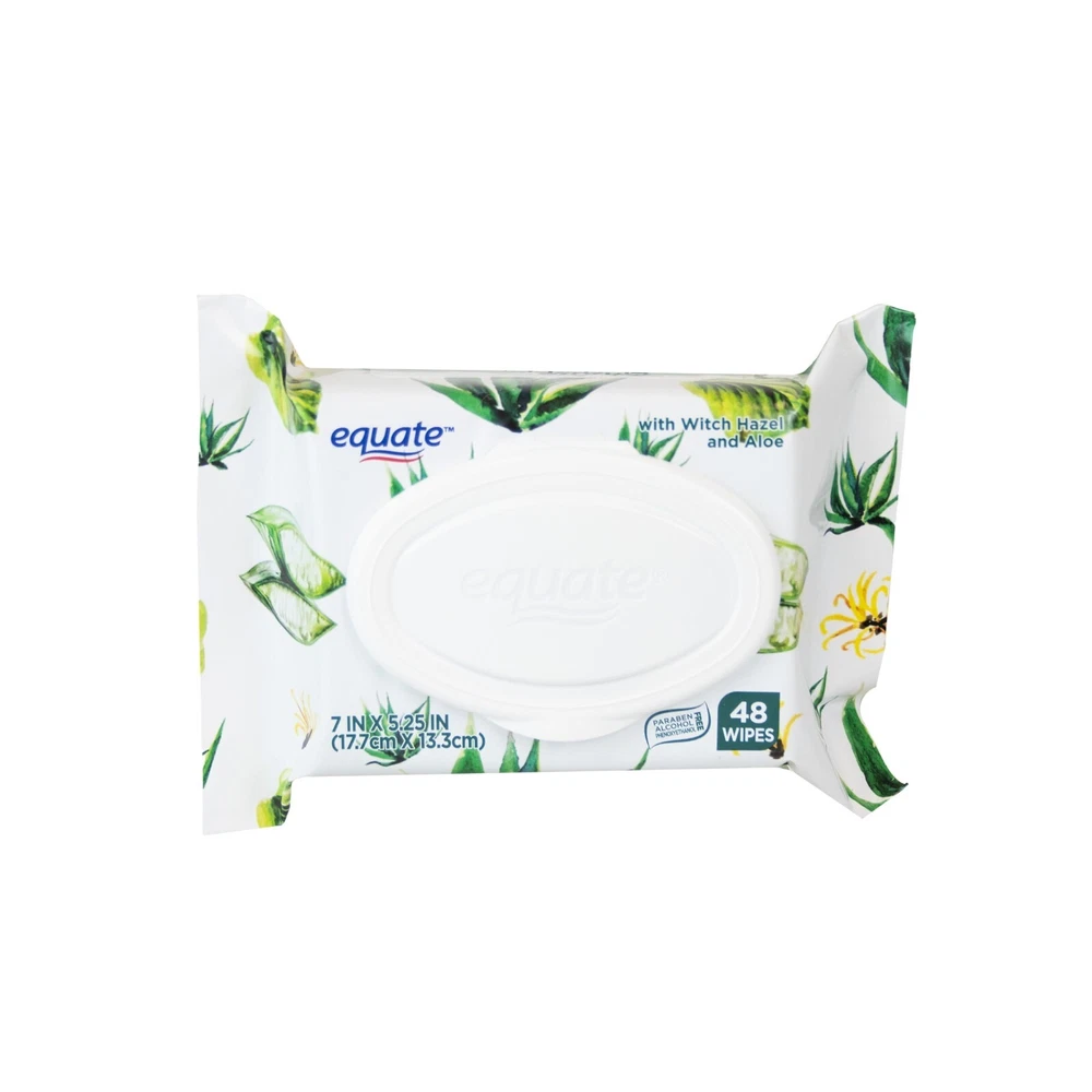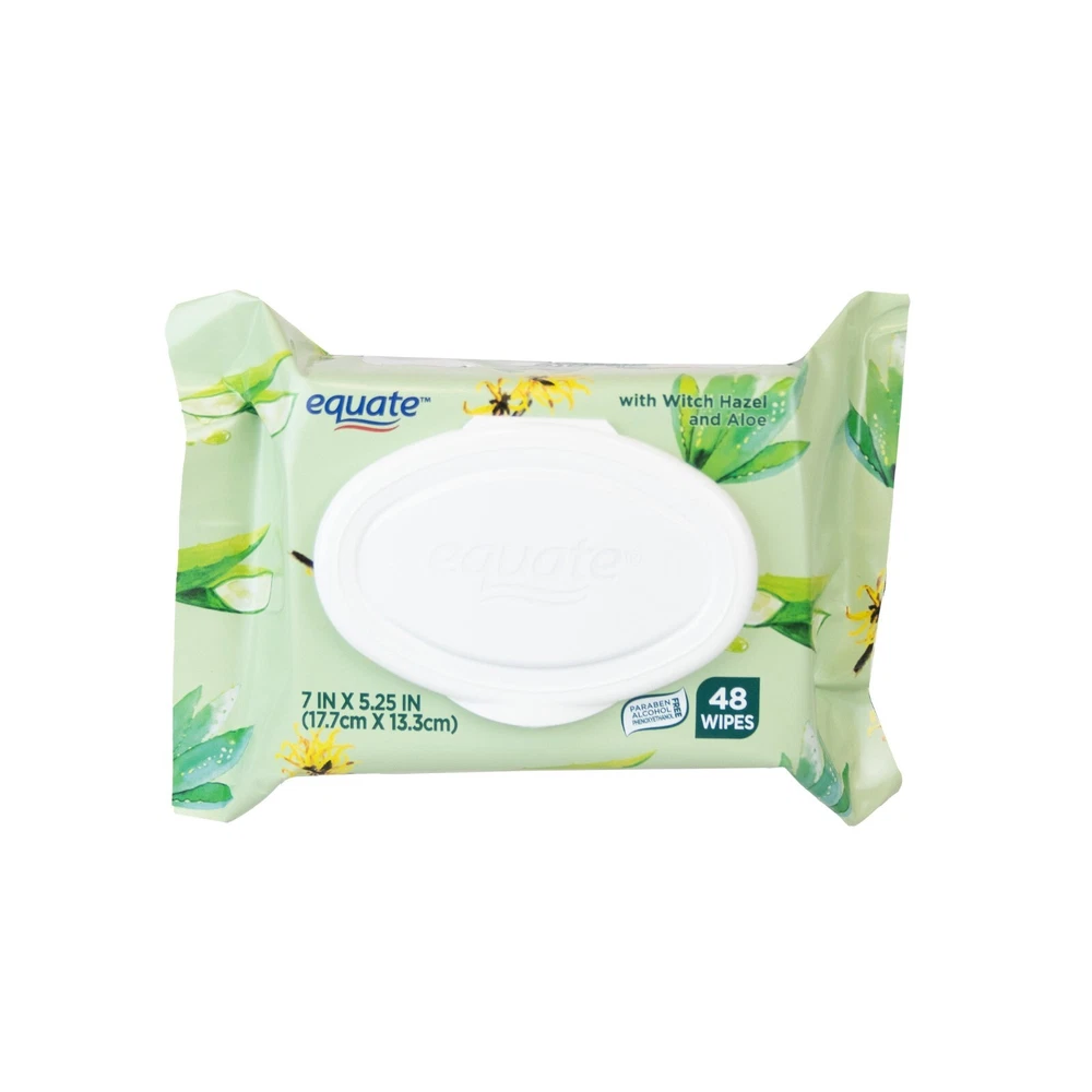 Equate Witch Hazel and Aloe Scent Flushable Wipes, 2 Flip-Top Packs (96 Total Wipes) About this item Product details Enhance your bathroom experience with Equate Witch Hazel and Aloe Scented Flushable Wet Wipes. Infused with chamomile, aloe, and vitamin E these soft wet wipes leave you feeling clean and fresh with the scent combination of Witch Hazel and Aloe. This pack contains two packages with 48 wipes each - totaling 96 wipes. The Easy Pop-Ups® Dispensing, resealable closure ensures the wipes stay moist and allows for easy access whenever you need them. Made with 100% plant-based fibers these clean quilt wipes are alcohol-free, paraben-free, dye-free, and phenoxyethanol-free with no harsh ingredients to provide a refreshingly clean experience. Making the right health decisions can be challenging. With a complete range of products and simple solutions, Equate allows you to take care of your family with confidence. Contains 2 Flip-Top Packs each containing 48 Wipes - 96 Total Flushable Wipes Witch Hazel and Aloe Scented Hypoallergenic Contains Aloe and Vitamin E Alcohol, phenoxyethanol and paraben free Great for the whole family! Easy Pop-Up Dispensing Made with 100% plant-based fibers Meets INDA flushable product guidelines (See disposal instructions) Wipes measure 7” x 5.25” Directions Instructions †Independent lab testing shows these wipes meet INDA Flushable Product Guidelines. Not all systems can accept flushable wipes. Ignoring Disposal Instructions may lead to clogs, property damage, or regulatory violations. Disposal Instructions Do not flush if: • Violates local rules • Using RV, marine, or aviation system • Using macerator toilet or household pump • Fat or grease are put in any drain or you are unsure of system capability Flushing OK if: • Permitted by local rules • One wipe per flush • No history of clogs or back ups • Septic follows EPA schedule for alternative systems (annual inspection & pumping) If a problem is noticed, dispose of in trash and stop flushing. Ingredients Inactive Ingredients Water Glycerin Cocamidopropyl PG-Dimonium Chloride Phosphate Sodium Benzoate Fragrance Citric Acid Aloe Barbadensis Leaf Extract Chamomilla Recutita (Matricaria) Flower Extract Tocopheryl Acetate Ingredients Ingredients: Water, Glycerin, Cocamidopropyl PG-Dimonium Chloride Phosphate, Sodium Benzoate, Fragrance, Citric Acid, Aloe Barbadensis Leaf Extract, Chamomilla Recutita (Matricaria) Flower Extract, Tocopheryl Acetate.