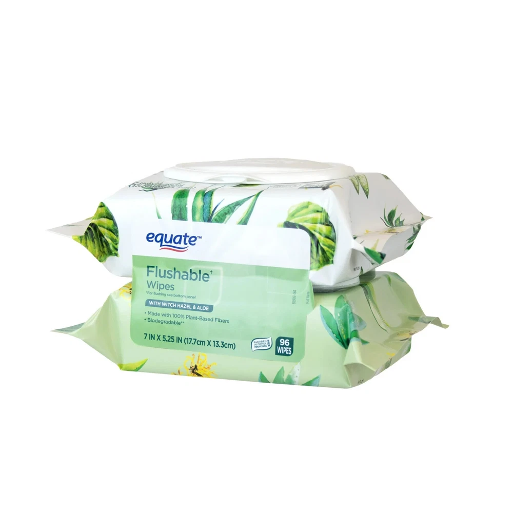 About this item Product details Enhance your bathroom experience with Equate Witch Hazel and Aloe Scented Flushable Wet Wipes. Infused with chamomile, aloe, and vitamin E these soft wet wipes leave you feeling clean and fresh with the scent combination of Witch Hazel and Aloe. This pack contains two packages with 48 wipes each - totaling 96 wipes. The Easy Pop-Ups® Dispensing, resealable closure ensures the wipes stay moist and allows for easy access whenever you need them. Made with 100% plant-based fibers these clean quilt wipes are alcohol-free, paraben-free, dye-free, and phenoxyethanol-free with no harsh ingredients to provide a refreshingly clean experience. Making the right health decisions can be challenging. With a complete range of products and simple solutions, Equate allows you to take care of your family with confidence. Contains 2 Flip-Top Packs each containing 48 Wipes - 96 Total Flushable Wipes Witch Hazel and Aloe Scented Hypoallergenic Contains Aloe and Vitamin E Alcohol, phenoxyethanol and paraben free Great for the whole family! Easy Pop-Up Dispensing Made with 100% plant-based fibers Meets INDA flushable product guidelines (See disposal instructions) Wipes measure 7” x 5.25”