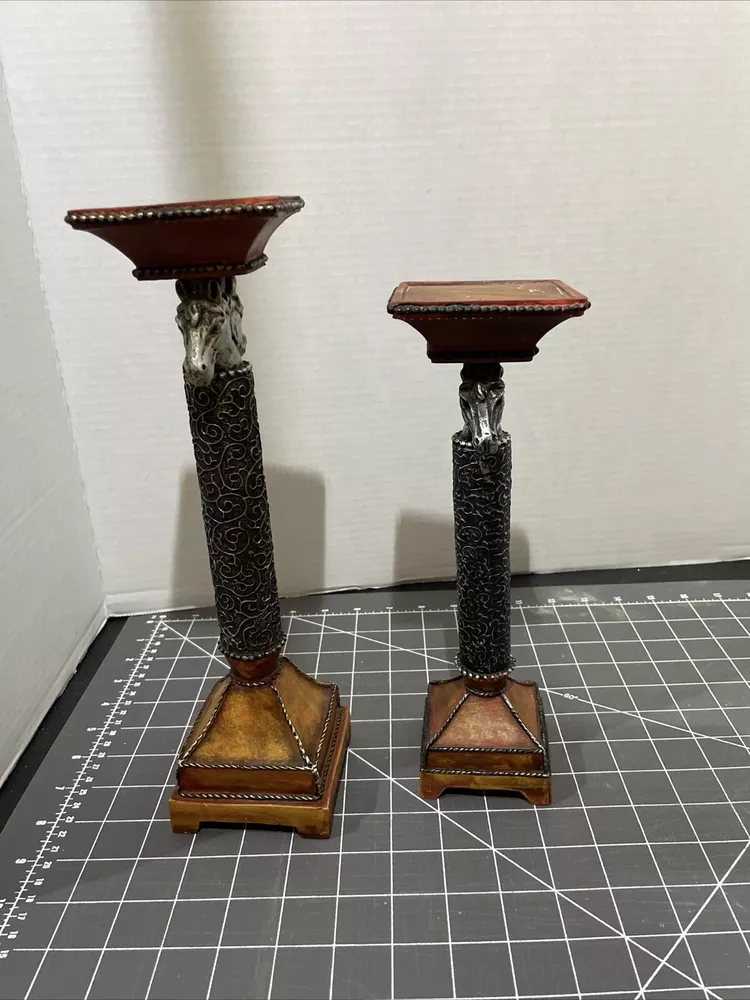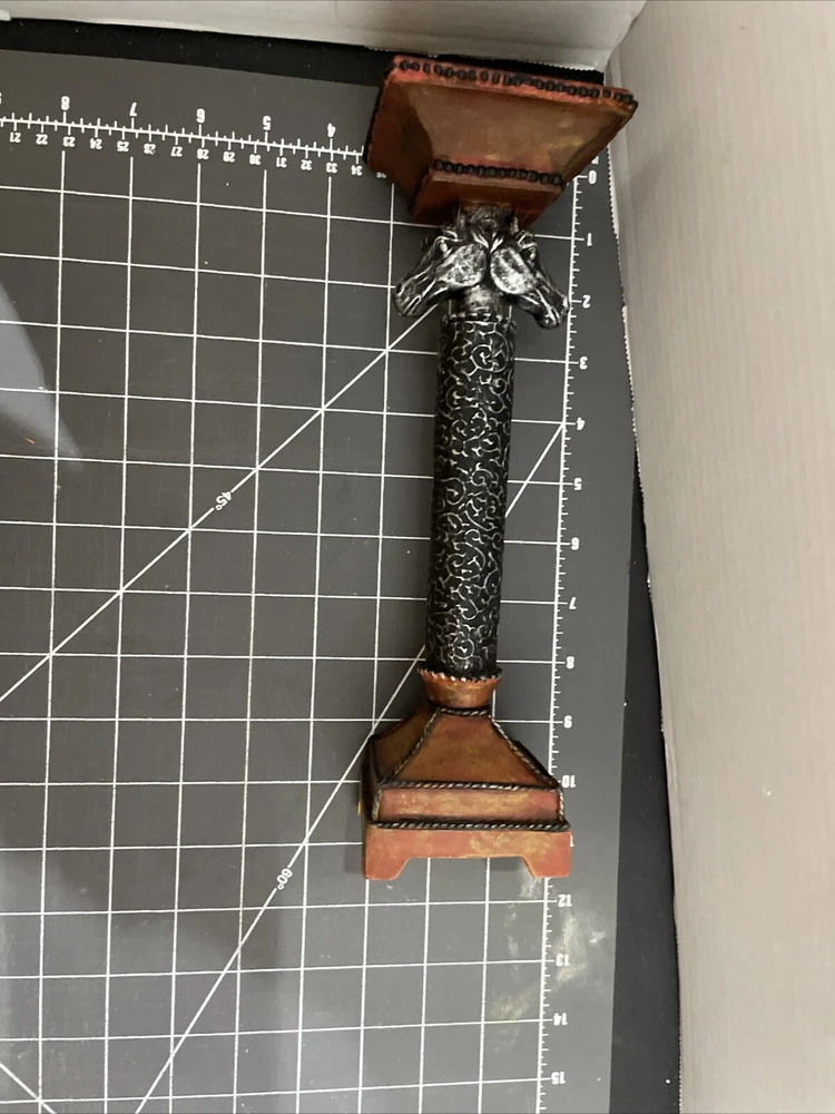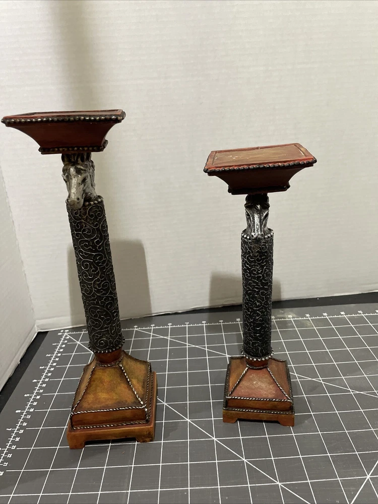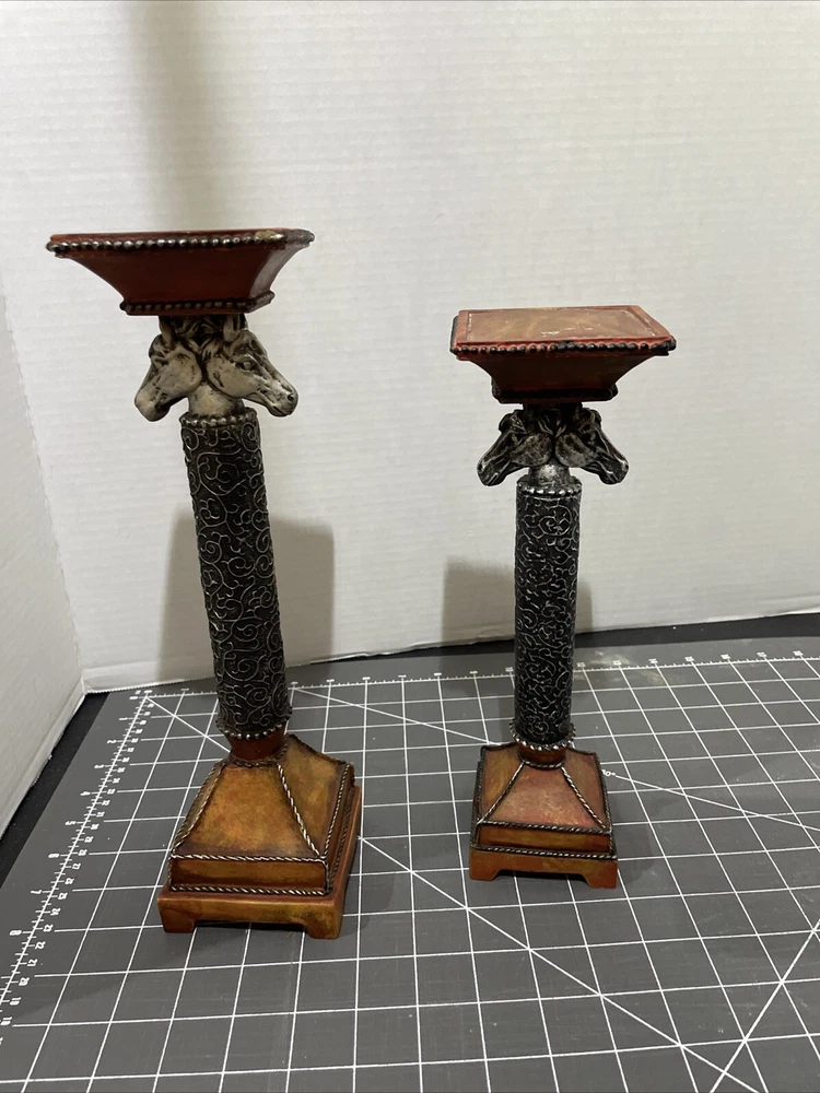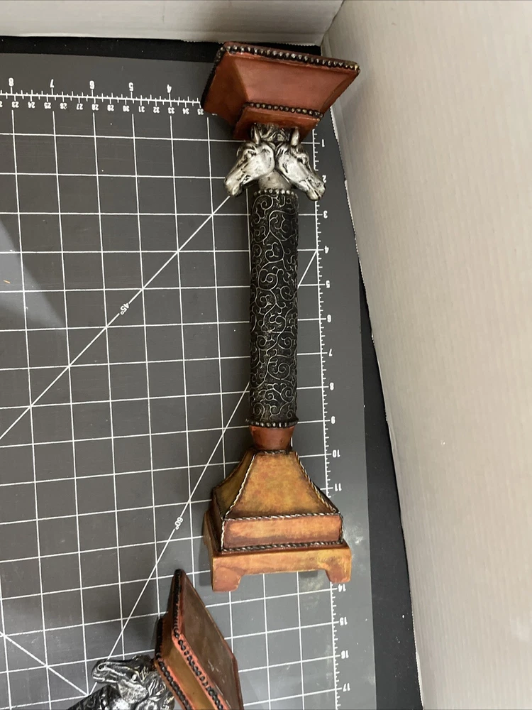 Equestrian 10” & 12” Column Candle Holder Pair Square Resin & Metal HandPainted