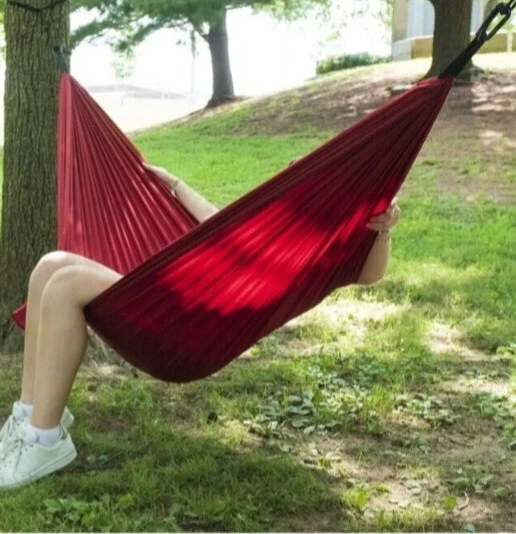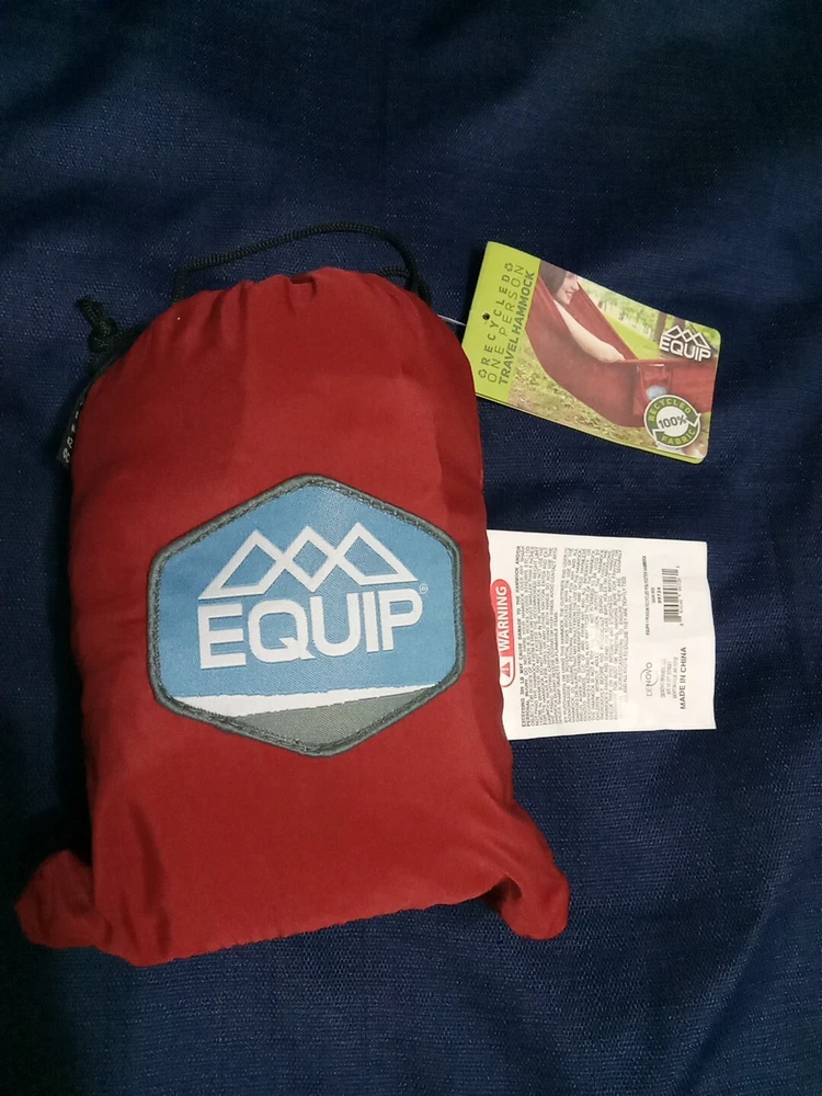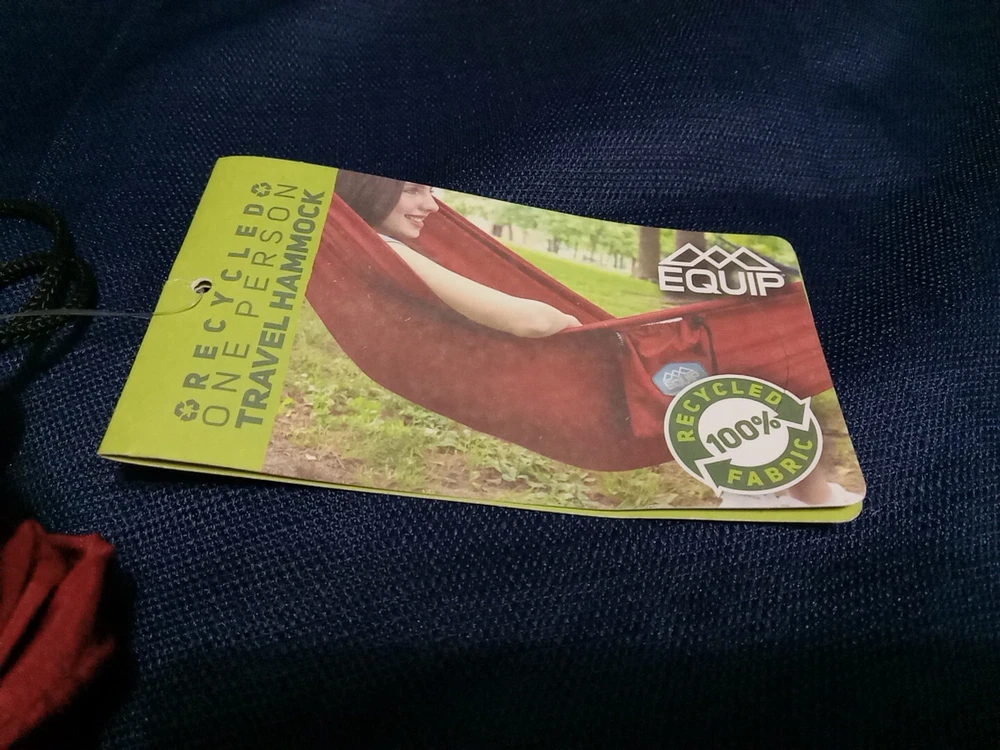 "This Equip One Person Recycled Polyester Hammock ensures you will always have a comfortable spot to relax when you're on-the-go, camping, fishing or just in your own backyard. This single hammock includes hammock straps and carabiners. This allows you to set up your hammock in just minutes, with no need to go buy anything extra. The 100% recycled polyester hammock is breathable and fast drying and the integrated loop system ensures a safe comfortable hang." Source: https://www.equipoutdoors.com/products/one-person-recycled-hammock-brick-red **Brand new, removed only to check it out but never hung up or used.**