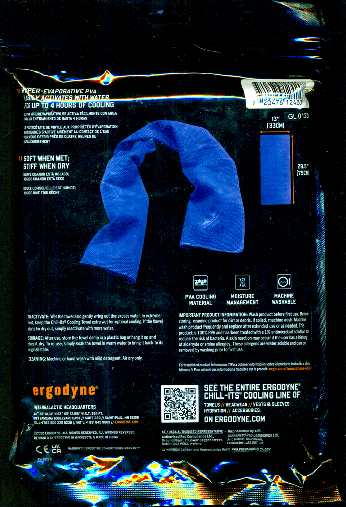 You are bidding on a 13 X 29 inch Blue Cooling Towel by ERGODYNE Work Gear. This towel provides instant cooling for up to 4-hours and is machine washable. See scan of front & back of the package. Shipping is $3.50 USPS. Good Luck !!