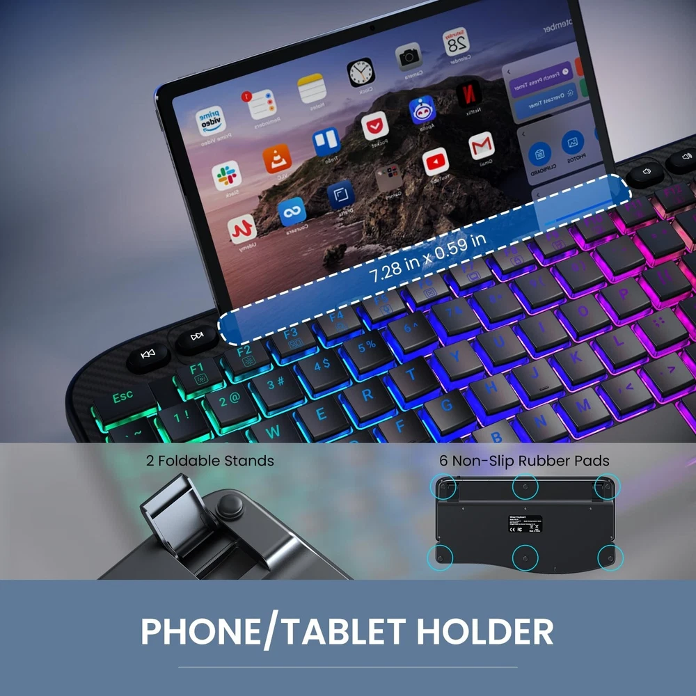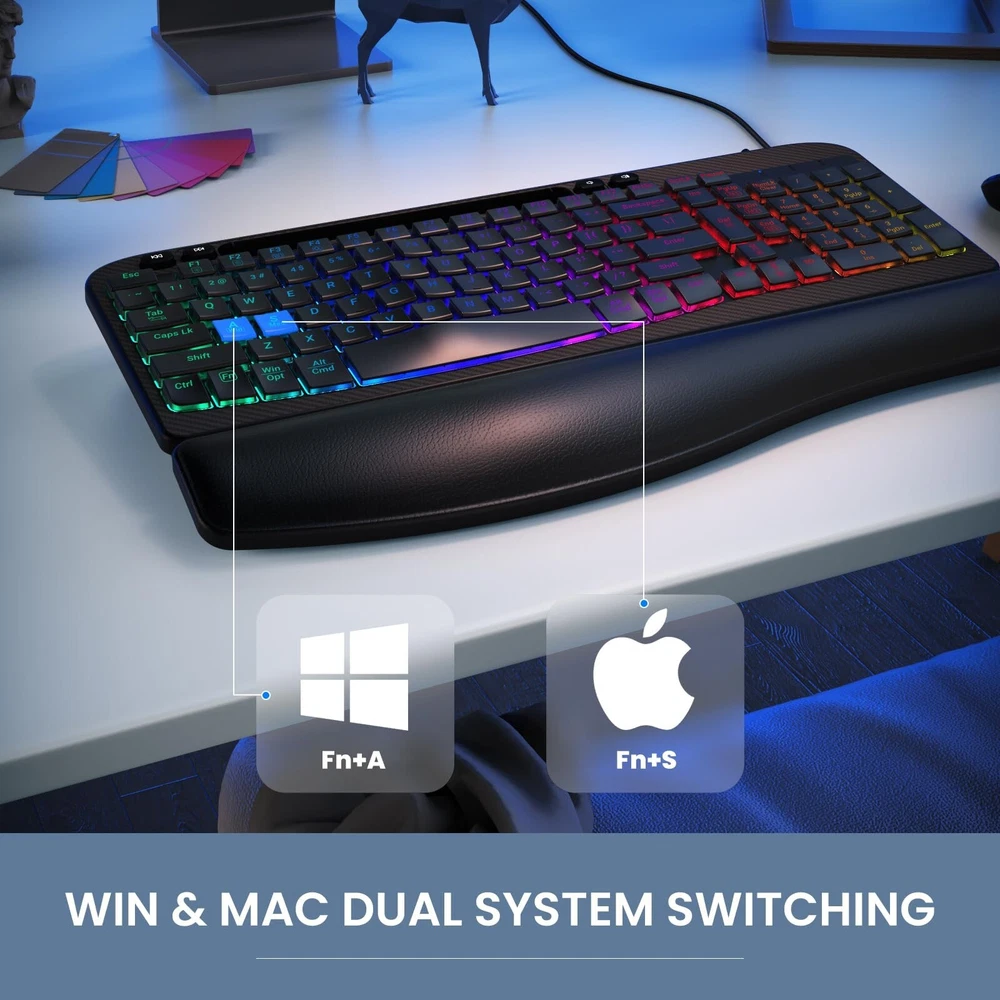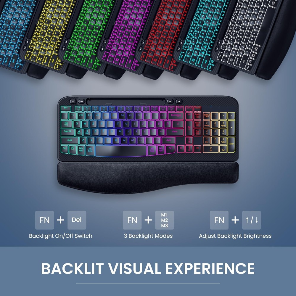 Ergonomic Backlit Keyboard with Wrist Rest, 7 Colors USB Wired Computer Keyboard, Wave Keys, with Phone/Tablet Holder, Comfortable Lighted Keyboard for PC, Windows and Mac Product Details Color: Black Brand: VEILZOR MPN: Does not apply UPC: Does not apply EAN: Does not apply Brand: VEILZOR Compatible Devices: Laptop, PC Connectivity Technology: USB wired Keyboard Description: Multi Functional Recommended Uses For Product: Multimedia, Everyday Use, Personal, Education, Business Special Feature: Ergonomic, Wave Keys Design, Backlit, Hotkeys and Media Keys, Wrist Rest Color: Black Number of Keys: 107 Keyboard backlighting color support: RGB Style: Contemporary Package Dimensions: 17.5 x 11 x 1.8 inches Item Weight: 2.35 pounds Manufacturer: VEILZOR Country of Origin: China Date First Available: January 22, 2025 Ergonomic Design: This ergonomic keyboard features a wave-shaped key layout that aligns with your hands natural position, reducing strain and improving typing comfort. The UV-coated keycaps enhance the durability of this backlit keyboard for long-lasting use. Soft Wrist Rest: The ergonomic keyboard includes a leather wrist rest that provides extra support, reducing wrist fatigue during extended typing sessions. Great for work and gaming, it promotes a more comfortable typing experience. 7-Color RGB Backlighting: The light-up keyboard offers 7 customizable colors and 4 brightness levels. Easily switch between lighting modes using FN + M1/M2/M3 to suit your environment or mood, enhancing both the functionality and aesthetic of your wired keyboard. Convenient Device Stand: The computer keyboard features a built-in groove to hold your phone, tablet, or other devices. This practical stand helps you stay organized and multitask efficiently while using your USB keyboard for both work and entertainment. Wired Connection: With a 5.2 ft braided cable, this wired keyboard provides a stable, lag-free connection. Enjoy uninterrupted performance during work or gaming without the need for charging or battery replacements, ensuring reliable functionality. Multifunctional & Compatible: The backlit keyboard supports FN key combinations and multimedia shortcuts. Note: Home=Shift+Number 7. It supports dual system switching for Windows and Mac, providing seamless functionality across multiple devices, making it versatile for different tasks.