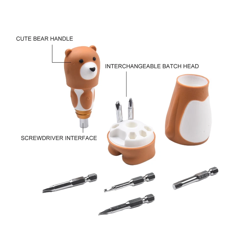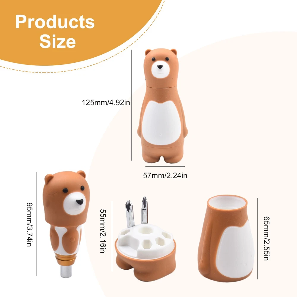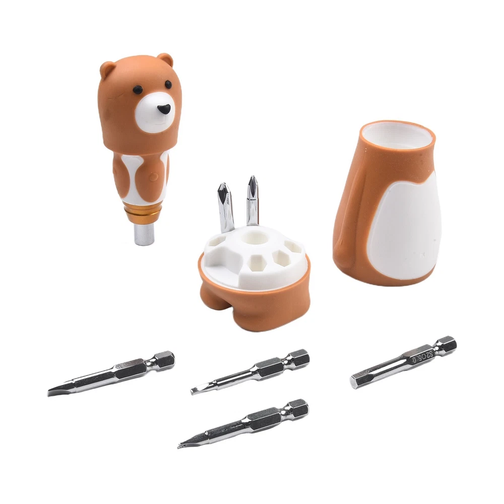 Ergonomic Design 6 In 1 Cartoon Bear Screwdriver Set for Comfortable Grip DESCRIPTION Features: *Brand new and high quality. *Made o f high-quality materials, . *The surfaces of the handle of the bear uses TPR non-slip handle, which is more comfortable to use. *Cute and convenient toy design. *6 In 1 screwdriver meets your multiple needs. Specifications: *Product name: Screwdriver Set *Color: Brown *Material: alloy steel *Size:as shown *Quantity: 1 Set Package Content: 1 Set Screwdriver Note: 1.Transition: 1cm=10mm=0.39inch. 2. The real color of the item may b e slightly different from the pictures shown on website caused by many factors such as brightness of your monitor and light brightness. 3. Please allow slight manual measurement deviation for the data. POLICES Shipping Payment WARRANTY We only ship to confirmed ebay Order addresses. Please comfirm that your Order address is in line with your shipping address. Please kindly note that the c ombined shipping is not provided because the shipping fee is calculated by weight. Also, the each additional item means exactly the the same color and size. It takes about 7 -15 working days to US; about 10-30 working days to other countries. Transit time may be a little delayed because of the bad weather and customs inspection . If you do not receive your item within 30 working days since payment finished, please contact us immediately for further assistance. Payment must be completed within 5 days. If you have any problems about payment, please contact us via ebay message. We strive for 100% customer satisfaction! Positive Feedback is very important to us. If you have any questions, p lease feel free to contact us via "Ask seller a question" . We will reply your email within 24 working hours. On Jan 2, 2025 at 07:44:40 PST, seller added the following information: