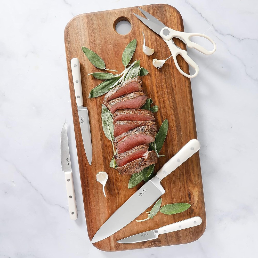Ergonomic Handle Stainless Steel Cutlery Set with Acacia Wood Block - 14 Pieces ‹ › ‹ › ‹ › ‹ › ‹ › ‹ › ‹ › Ergonomic Handle Stainless Steel Cutlery Set -14 Pieces What's in the box: One 8-inch chef's knife One 7-inch santoku knife One 8-inch bread knife One 5-inch utility knife One 3.5-inch paring knife Six 4.5-inch steak knives One pair of kitchen shears One sharpening steel One acacia wood block Features: Forged stainless steel knives with full tang construction for balance and durability Ergonomic handles for comfortable and balanced grips Triple-riveted handles in classic linen white color Sturdy acacia wood knife block for safe storage Hand wash only Easy to clean the wood block with a soft, damp cloth Benefits: Precise cuts and smooth food release Perfect for dicing, mincing, chopping, and more Complete set for all your food prep needs Comfortable and balanced grips for easy handling Stylish and timeless design Safe storage with the acacia wood block Durable and long-lasting Easy to clean and maintain Why choose our Ergonomic Handle Stainless Steel Cutlery Set? Upgrade your kitchen with our high-quality Ergonomic Handle Stainless Steel Cutlery Set. Made from forged stainless steel with full tang construction, these knives ensure precise cuts and smooth food release. The ergonomic handles provide comfortable and balanced grips, making it easy to dice, mince, chop, and more. With a sturdy acacia wood knife block for safe storage, this set is not only functional but also stylish. Plus, it's easy to clean and maintain, ensuring long-lasting durability. Don't settle for less - choose our Ergonomic Handle Stainless Steel Cutlery Set for all your food prep needs. Order now and experience the difference in your kitchen! Shipping Free & Fast Shipping - We offer free shipping to most of the USA with a normal delivery time of 3-7 days. However, due to the current situation, additional delivery time (up to 3 weeks) may be required for some items. Alternative Carriers - We may use alternative carriers (e.g. USPS, FedEx, UPS, etc.) to ensure your package arrives safely and on time. Due to the use of multiple carriers, we are unable to provide a tracking number automatically. Handling Time - Orders are processed and shipped within 1-2 business days of receiving cleared payment. Shipping Restrictions - Shipping to Alaska, Hawaii, Puerto Rico, Guam, and other US territories may incur shipping charges or delivery restrictions. Please contact us before ordering, or your order can be refunded/cancelled. State Restrictions - There may be restrictions based on your state of purchase. For example, certain items may not be shipped to California due to state regulations. Contact for Tracking Updates - If you require tracking updates or have any concerns about the delivery of your order, please feel free to contact us, and we will be happy to assist you. Return 30-Day Hassle-Free Returns - We want you to be completely satisfied with your purchase. If you are not, you can return the item within 30 days of receiving it for a full refund or exchange. Easy Return Process - To start a return, simply contact us and we will provide you with a prepaid return shipping label and detailed instructions. Restocking Fee - There are no restocking fees for returns. However, the buyer is responsible for return shipping costs if the return is not due to a seller's error. Refund Processing Time - Refunds will be processed within 5 business days of receiving the returned item in its original condition. Payment We accept all major credit cards, PayPal, and Apple Pay for your convenience. Your payment information is secure and encrypted to ensure a safe and seamless transaction. Please complete your payment within 3 days of purchase to avoid any delays in shipping. Feedback Your feedback is extremely important to us. We strive to provide the best products and customer service possible. If you are satisfied with your purchase, please take a moment to leave us a positive review. If you have any concerns or issues with your order, please contact us before leaving negative feedback. We are committed to resolving any problems and ensuring your satisfaction. Contact Us If you have any questions or concerns, please feel free to reach out to our customer support team. You can contact us through the eBay messaging system. We are available Monday to Friday, 9:00 am to 5:00 pm EST, and we will do our best to respond to your inquiry within 24 hours. Thank you for supporting our small family business!