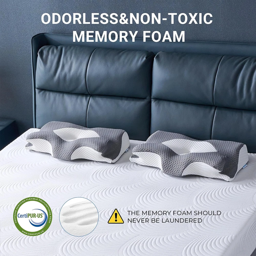 TWO FIRMNESS OPTIONS: This is the old version--It has an overall softer feel, which differs from the 2022 version. If you prefer a softer pillow, you can choose the Polyurethane option. To meet the needs of a broader range of users, we have also introduced an upgraded, firmer option—select the Memory Foam option. ERGONOMIC DESIGN: Elviros ergonomic pillows are well designed to support by following the natural curve of your body keeps air passages optimal for less snoring and more restful sleep. The cutouts on the side give your top arm a place to rest and keep it at an angle so your shoulder is not hunching over in front of you. TWO HEIGHTS---DESIGNED FOR BACK & SIDE SLEEPING: SIZE 25.2Lx15Wx(4.1"-4.9")H, Back sleepers with cervical issues can sleep on the higher side (4.9inch) of the pillow with 2 horns as this side provides better support for the head and cervical, so as to keeps your neck properly aligned with the rest of your body. The neck support pillow is suitable for different sleeping positions: back, stomach and side sleeping. PREMIUM MEMORY FOAM PILLOW: The Elviros pillow core has been upgraded based on popular feedback and it's firmer than traditional pillow and softer than latex pillow. But if you prefer sleeping on extra firm pillows, we recommend visiting our store to explore other styles. NOTE: THE MEMORY FOAM ITSELF WILL HAVE A VERY LIGHT SMELL, IF YOU ARE UNACCEPTABLE, PLEASE VENTILABLE IT FOR 3-15 DAYS. REMOVABLE BREATHABLE PILLOWCASE: The Elviros neck pillow features ice-silk fabric that improves breathability, providing a cooler and more comfortable sleep experience. Certified by Oeko-Tex for safety and quality, the pillowcase is both skin-friendly and durable, offering lasting comfort all night long. NOTE: THE PACKAGE BOX YOU RECEIVE WILL BE WRAPPED WITH TAPE AT THE SEAL, WHICH IS NOT USED PRODUCTS, BUT ADDED FOR BETTER FIXING AND ENSURING THE INTEGRITY OF THE PRODUCTS INSIDE. Product Description
