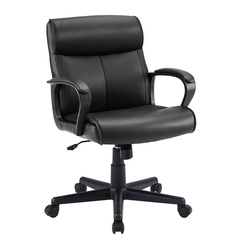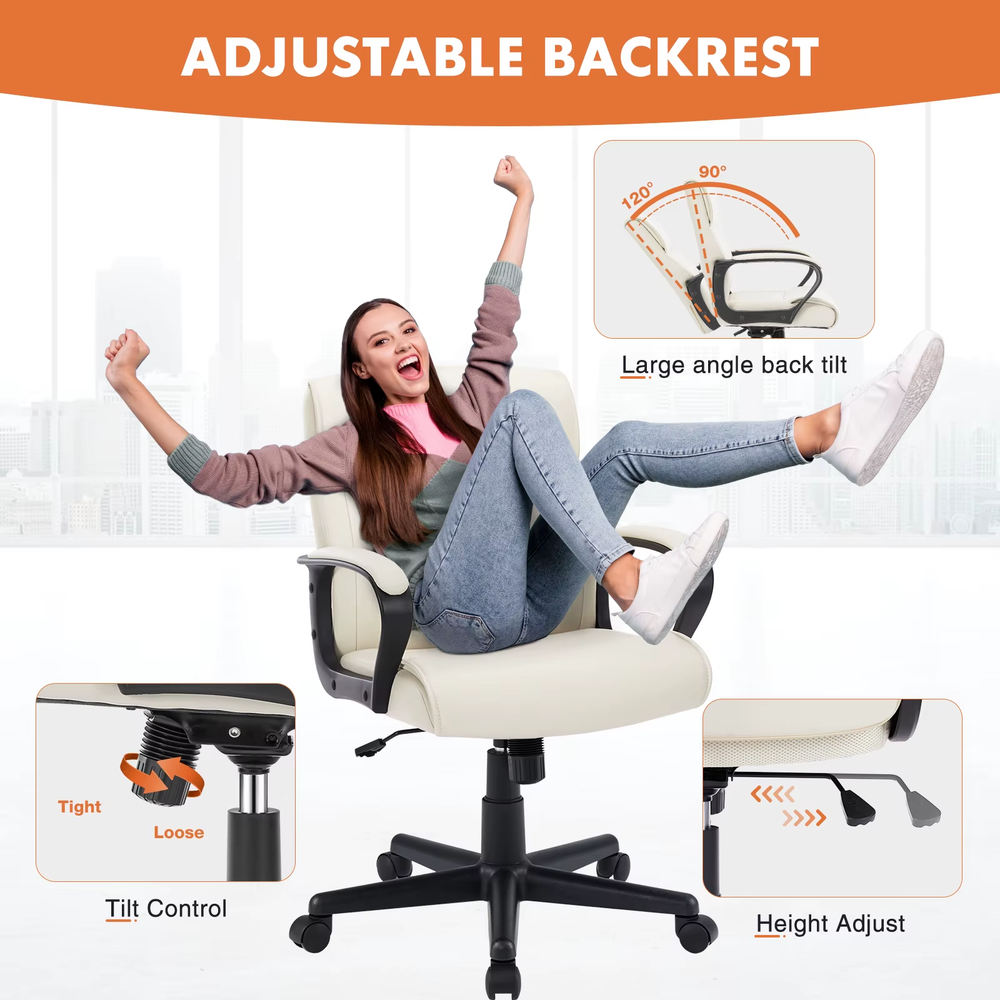 About this item ERGONOMIC BACKREST - The backrest of the office chair is curved to fully adapt to your spine, reduce hunchback, and correct your sitting posture. It also provides good lumbar support for long office hours, relieves fatigue, and reduces aches and pains. HIGH-GRADE LEATHER - The ergonomic office chair is made of high-grade upholstered leather with springs and foam cushions, making it very comfortable to sit on. The silver shine of the base and handles, as well as the finish and texture of the leather material, make this chair look very upscale in your office. The upholstered seat cushion and padded armrests provide all-day comfort and support, making it ideal for the office or conference room. MULTI-ADJUSTMENT - This home office desk chair features a gas lift mechanism. You can adjust its height smoothly by pushing the lever located under the seat. This manager swivel chair can be adjusted for height and tilt, so you can get the most comfortable office entertainment and rest use according to your needs. SAFETY GUARANTEE - This big and tall office chair offers a heavy-duty durable nylon painted base that strictly meets BIFMA standards, a safe gas lift, and rolling nylon silent casters to protect the floor. Can support adults up to 300 lbs. The base is quite wide, giving you plenty of extra space. QUICK INSTALLATION - We are committed to bringing a great experience to all our customers. If you have any questions about the chair, please feel free to contact us. We will solve all the problems for you.