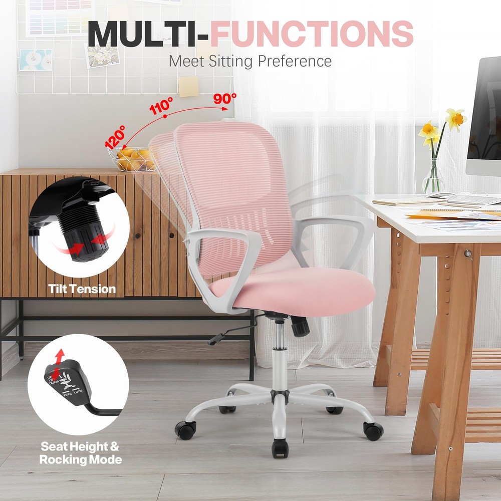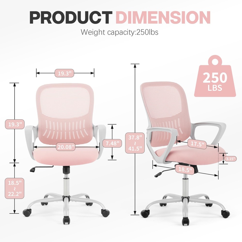 About this item Ergonomic Comfort: Ergonomically designed to support the natural curvature of the spine, this office chair promotes correct posture and reduces back strain while working.Meanwhile, this office chair features a breathable mesh backrest and upholstered seat that provides all-day comfort. Versatile Recline Positions: Easily adjust the chair's height, tilt angle and the chair's 360-degree swivel function to find your ideal sitting position according to your personal needs, perfect for home office, study, game setup and more. Superior Breathability: This chair is designed with premium breathable mesh fabric, keeping you cool and comfortable even during extended sitting sessions. The mesh back adds a modern aesthetic, aligning with the dynamic nature of workspaces. Sturdy and Stable Construction: This chair features a sturdy metal base, with a durable metal frame, smooth-rolling casters, and a weight capacity of 250 lbs, this chair accommodates users of various body types with ease. Effortless Assembly: Enjoy stress-free setup with our comprehensive installation instructions and included tools, ensuring you can assemble your product with ease.