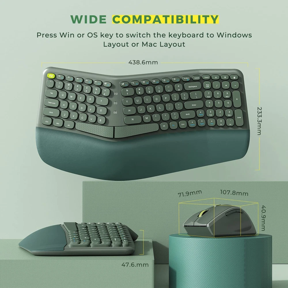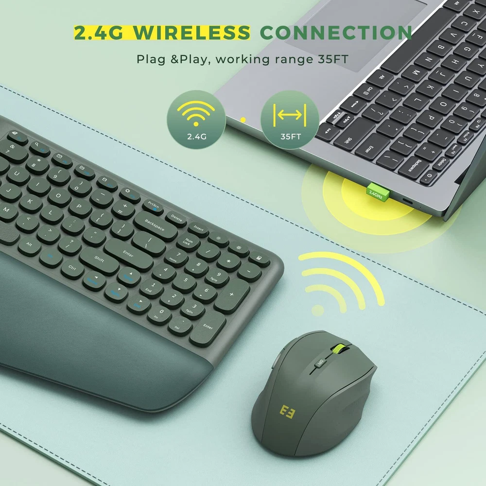 [Plug & Play Convenience] [Plug & Play Convenience] - This wireless keyboard and combo utilize a single USB receiver, eliminating the hassle of dealing with multiple receivers. Simply insert the USB into your computer interface, wait a few seconds, and enjoy a seamless connection with a range of up to 10 meters. Experience smoother work processes and the freedom to connect anytime, anywhere! [Ergonomic Comfort Design] - The elegantly curved unibody design allows your wrists to rest naturally on the keyboard, reducing strain on your hands, wrists, and shoulders after extended periods of use. The keyboard is complemented by a contoured that offers a comfortable grip and a secure thumb support, ensuring your fingers are fully relaxed. This upgrade isn't just about technology—it's an investment in your . [Full-Sized Efficiency] - Measuring 44*23*4.7cm, this keyboard features a dedicated numeric keypad for faster and more accurate data input. The 12 convenient shortcut keys provide easy access to frequently used functions like opening files, browsers, emails, and other applications. [Ultimate Wrist Support] - Crafted from high-quality PU material, the keyboard wrist rest offers excellent tactile feedback and resilience. It provides optimal support and cushioning tailored to the shape and posture of your wrist, reducing strain and fatigue during extended keyboard use. Easily maintain a comfortable posture for prolonged periods and keep it clean with a simple wipe using a damp cloth or clean water. [Effortless Wireless Connectivity] - Utilizing 2.4GHz wireless technology, this keyboard and ensure stable and rapid data transmission. Enjoy the freedom of working and playing within a broader range, embracing a wireless experience with unparalleled ease.