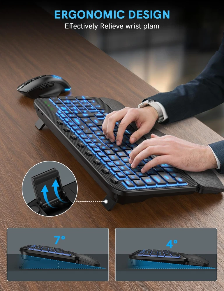 WIRELESS WAVE KEYBOARD: Experience a new level of comfort with our wave-shaped ergonomic keyboard and mouse combo. Designed to support your natural hand position, the wave-shaped keyboard reduces strain All-DAY PALM SUPPORT: A leather-cushioned palm rest ergo keyboard with memory foam provides lasting wrist support. The 4° or 7° adjustable typing angle lets you find the perfect height, while the ergonomic wireless mouse offers a natural grip for effortless control ILLUMINATE YOUR WORKSPACE: The wave ergonomic wireless keyboard features 7 switchable backlights, paired with an RGB mouse that automatically changes colors. Even in the dark, the illuminated keys make typing easy. Adjust the brightness or turn off the lights anytime to save power USB-C QUICK CHARGING: The rechargeable wireless keyboard mouse stays powered for up to 5 days on a full charge (2 months with backlighting off). The mouse lasts up to 6 days on a full charge. Includes auto-sleep mode and independent ON/OFF switches for efficient energy use DUAL SYSTEM LAYOUT: Seamlessly switch between Windows and Mac layouts with FN+A/FN+S on the light up keyboard. Enjoy lag-free, reliable 2.4G wireless technology for smooth performance across both systems PERFECT STROKE KEYS: Scooped keys match the shape of your fingertips, while high keycaps are designed for comfort and efficiency. So you can type with confidence on a wireless keyboard crafted for comfort, precision and fluidity