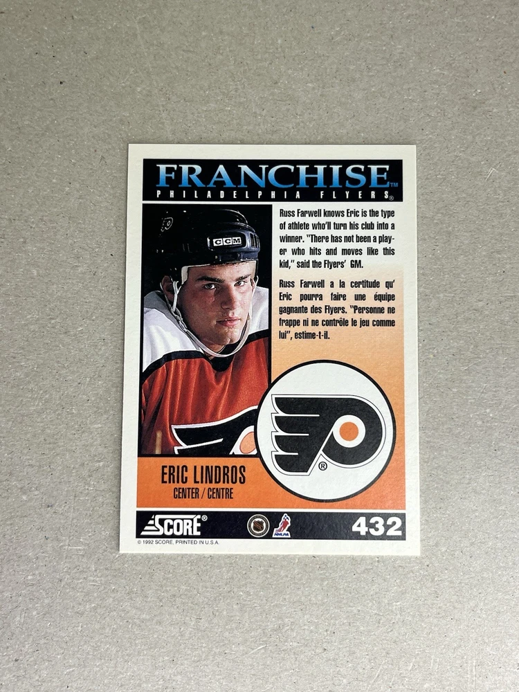 This 1992-93 Score Canadian hockey card features Eric Lindros of the Philadelphia Flyers, card number 432. Made of sturdy card stock and part of the National Hockey League (NHL) base set, this original trading card is a must-have for any hockey fan or collector. The card is in standard size and manufactured in the United States by SCORE in 1992. As a fan of the sport, this card is a great addition to any collection and a perfect way to show support for your favorite team. The card is not vintage and does not come with any licensed reprints, it is an original piece. This trading card is a perfect gift for any hockey enthusiast and is sure to be a cherished addition to any collection.