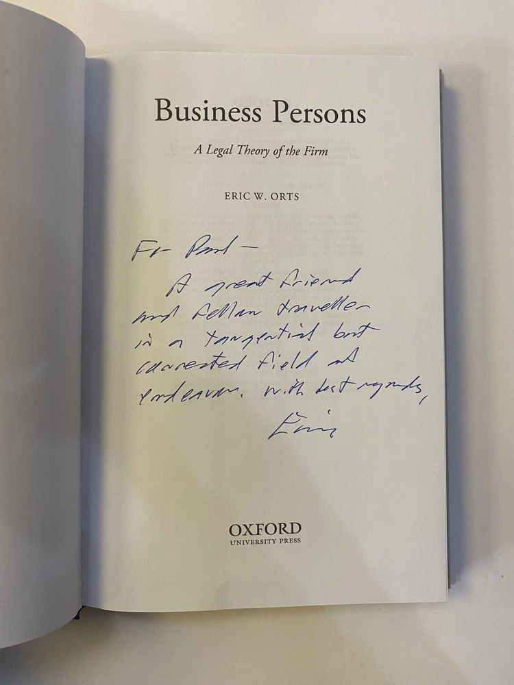 BUSINESS PERSONS: A LEGAL THEORY OF THE FIRM [Inscribed] Author: Orts, Eric W. Title: BUSINESS PERSONS: A LEGAL THEORY OF THE FIRM [Inscribed] Publication: Oxford: Oxford University Press, 2013 Edition: First Edition, First Printing Description: Octavo, xx, 304 pages. In Very Good minus condition with a Very Good minus dust jacket. Blue spine with white lettering. Dust jacket protected in mylar covering. Minor shelf wear on head and tail of spine. Minor wear and scuffing on dust jacket. Interior pages clean. Inscribed by Orts on title page. Shelved Law. Seller ID: 1391305 Subject: Dupont Circle, Politics, Government, and Law, Social Sciences Welcome to the eBay store of Second Story Books! DC's Oldest Rare and Used Bookstore, Second Story Books operates two open shops in the Washington D.C. metropolitan area. We have an extensive internet presence and provide accredited appraisals member ASA. This listing was created by Bibliopolis.