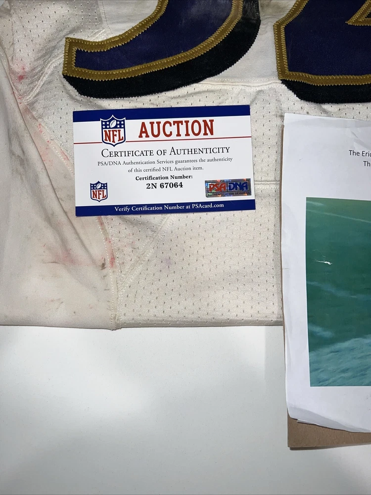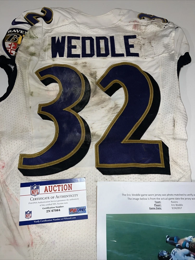 This Eric Weddle game-worn Ravens jersey is a must-have for any football fan. The jersey was actually worn by Weddle during a game on September 24, 2017, making it a highly sought-after item for collectors. The photo match ensures that the jersey is authentic and adds to its overall value. The jersey is made in Weddle's home country of Canada and features the Ravens logo on the front. It is perfect for fans of the National Football League (NFL) and is a great addition to any collection of game-used memorabilia. Don't miss out on the chance to own this unique piece of football history.