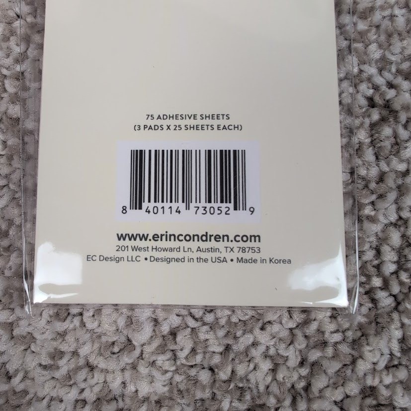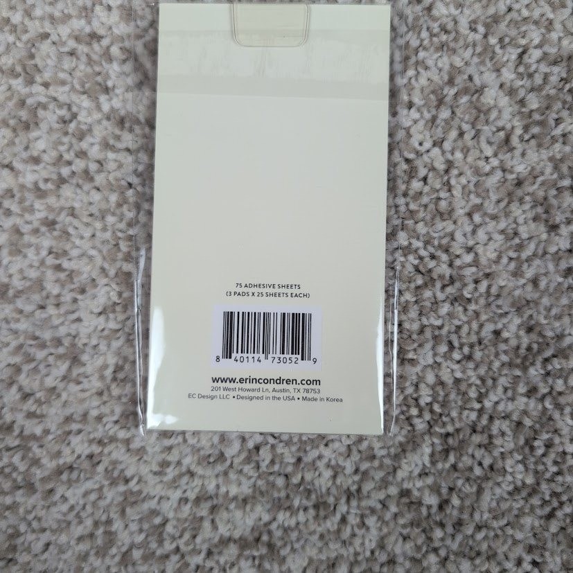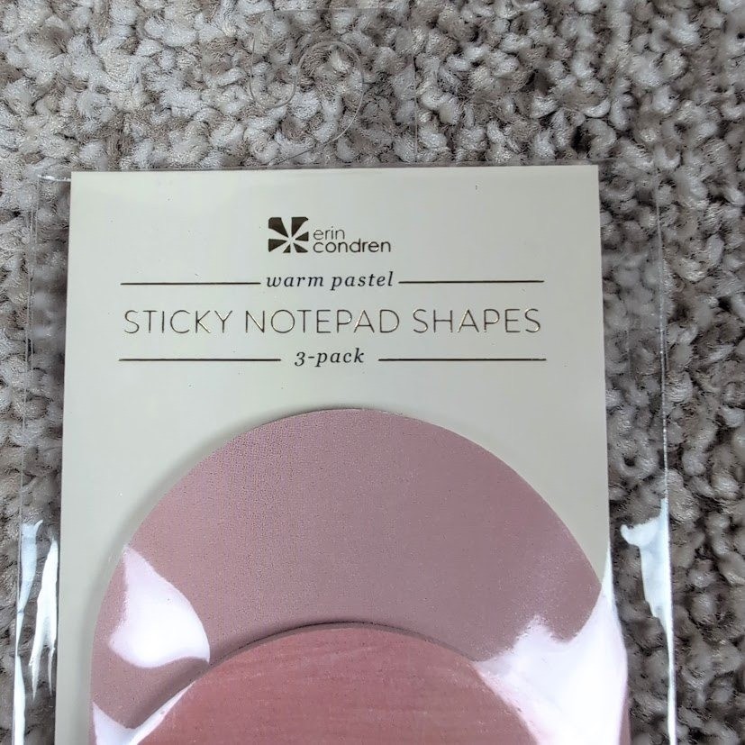 Erin Condren warm pastel sticky notepad shapes 3 pack adhesive sheets. This set includes three distinct pads, each containing 25 sheets for a total of 75 adhesive sheets. The pads feature unique semi-circular shapes in coordinating pastel hues. One pad is a solid soft pink with a subtle 'to-do' graphic. The middle pad displays a textured watercolor-inspired design in shades of pink and coral. The largest pad is a soft lavender pink. These sticky notes are perfect for adding a touch of color and organization to planners notebooks and various paper crafts. From Smoke Free/Cat Friendly Home Keywords: Erin Condren, sticky notes, notepad, planner accessories, stationery, pastel colors, organization, scrapbooking, craft supplies, adhesive notes, to do list, paper crafts