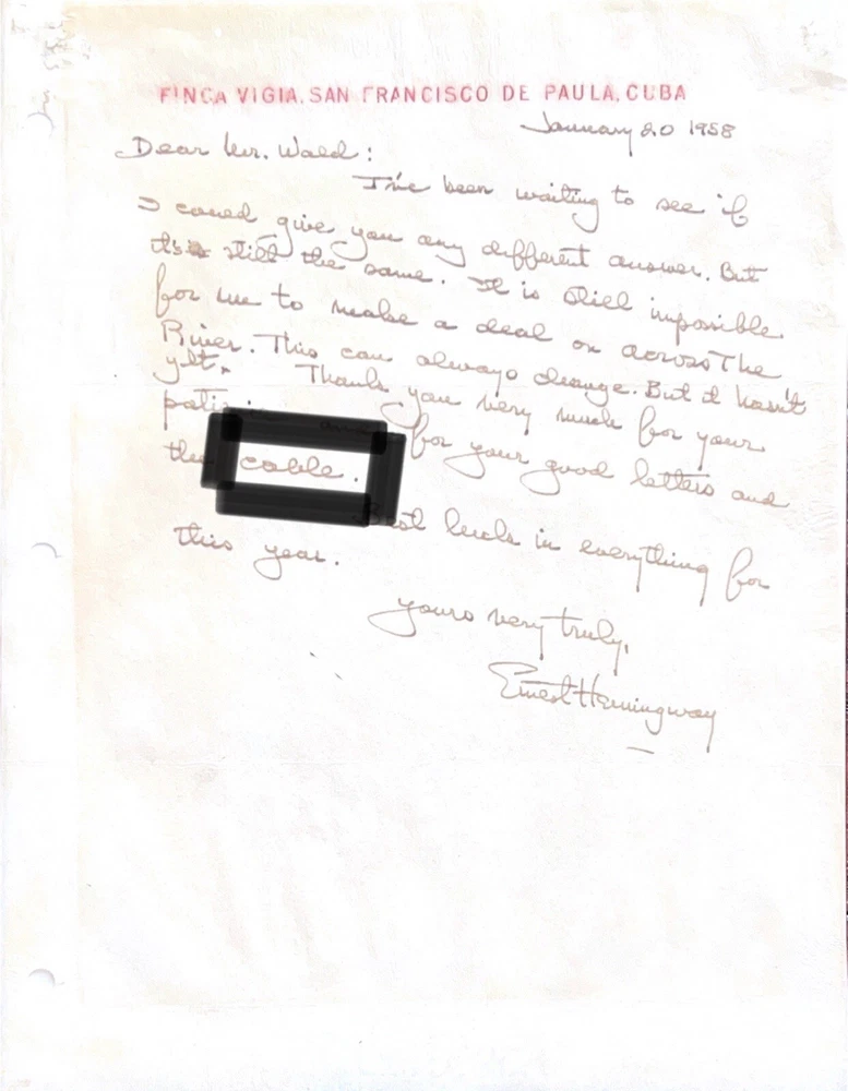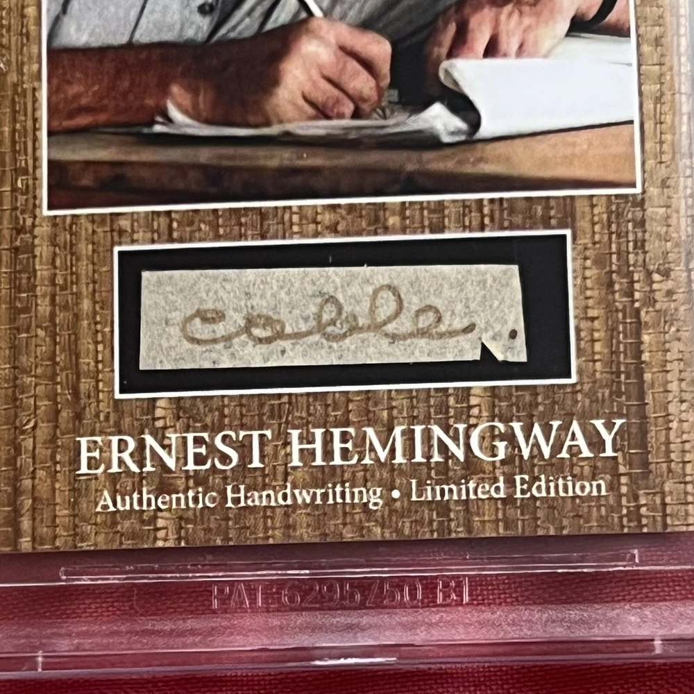 Offered for the first time ever – genuine handwritten words from renowned American novelist, short story writer and journalist, Ernest Hemingway, authenticated and encapsulated by Beckett. You will not receive a copy of the letter from Hemingway, the 4th image is shown purely to illustrate where the words came from. You will only receive the BAS encapsulated word, encapsulate #00017196053. An exclusive CutWordCo Limited Edition, this is the first set of Hemingway words encapsulated by Beckett we’ve ever offered for sale! Each individual word was carefully removed from an original handwritten letter from Hemingway. Own penmanship from the same hand that wrote classics such as “The Old Man and the Sea”, and “For Whom the Bell Tolls”, and “A Farewell to Arms”. Each encapsulated word was individually removed from a January 1958 letter from Hemingway on his beloved Finca Vigia letterhead. Writing from his home overlooking downtown Havana, Hemingway found himself unable to reach a deal on his novel, “Across the River and into the Trees”, despite the persistence of his correspondent. Genuine Hemingway documents can often fetch thousands of dollars. The cost of authenticating a single word of Hemingway’s handwriting is $100 on Beckett's website.