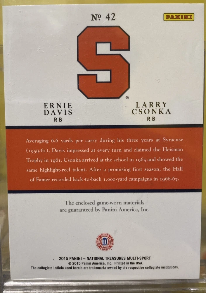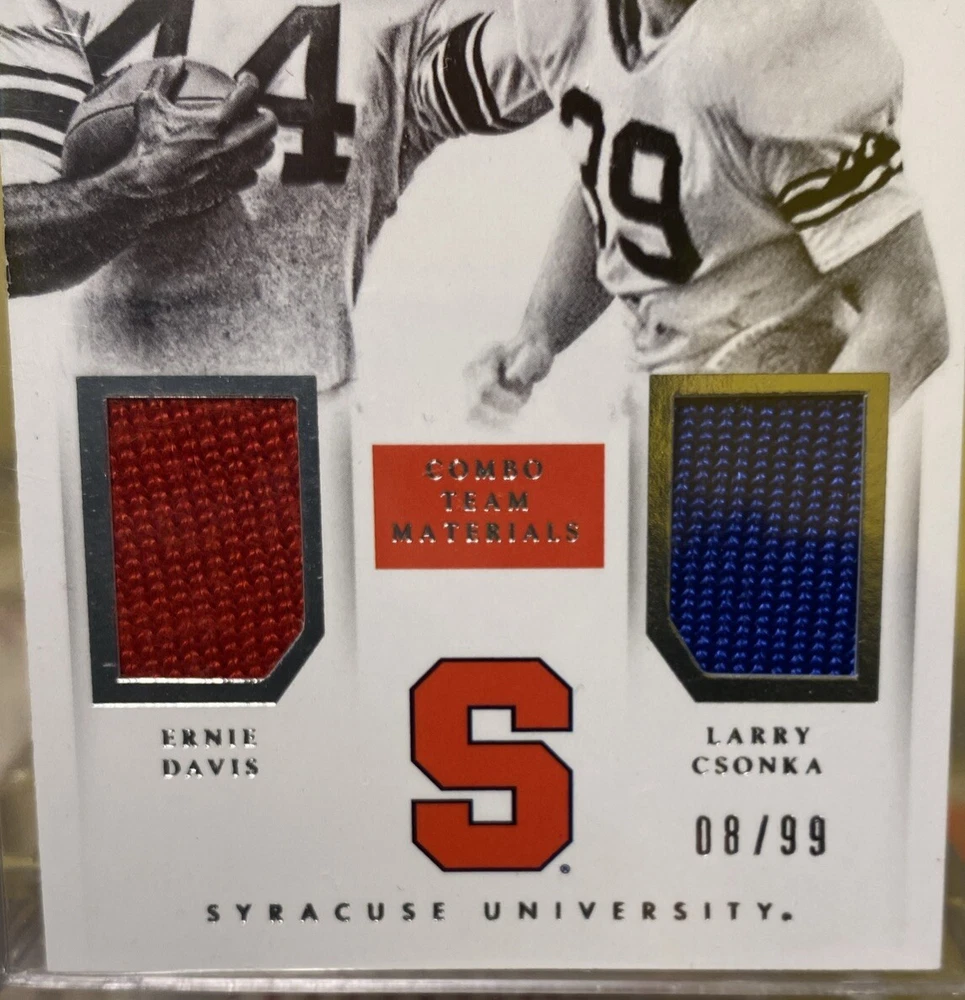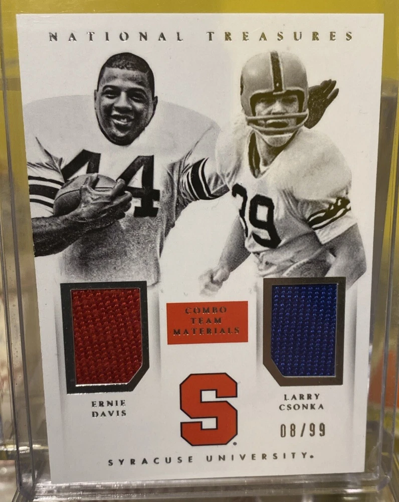 Own a piece of football history with this rare Ernie Davis & Larry Csonka Patch from the 2015 Panini National Treasures College set. This limited edition card features memorabilia from both College football Hall of Fame players and is a must-have for any Syracuse Orange fan. The card is numbered 42 and has a print run of 08/99, making it a valuable addition to any sports trading card collection. The card is perfect for display and is a great conversation starter.
