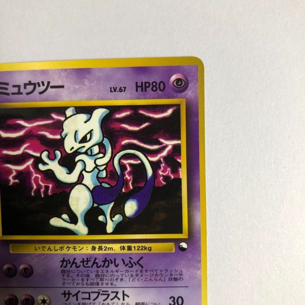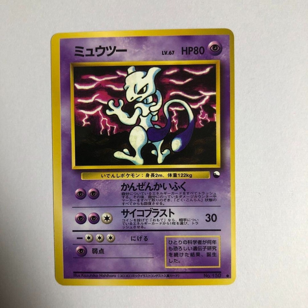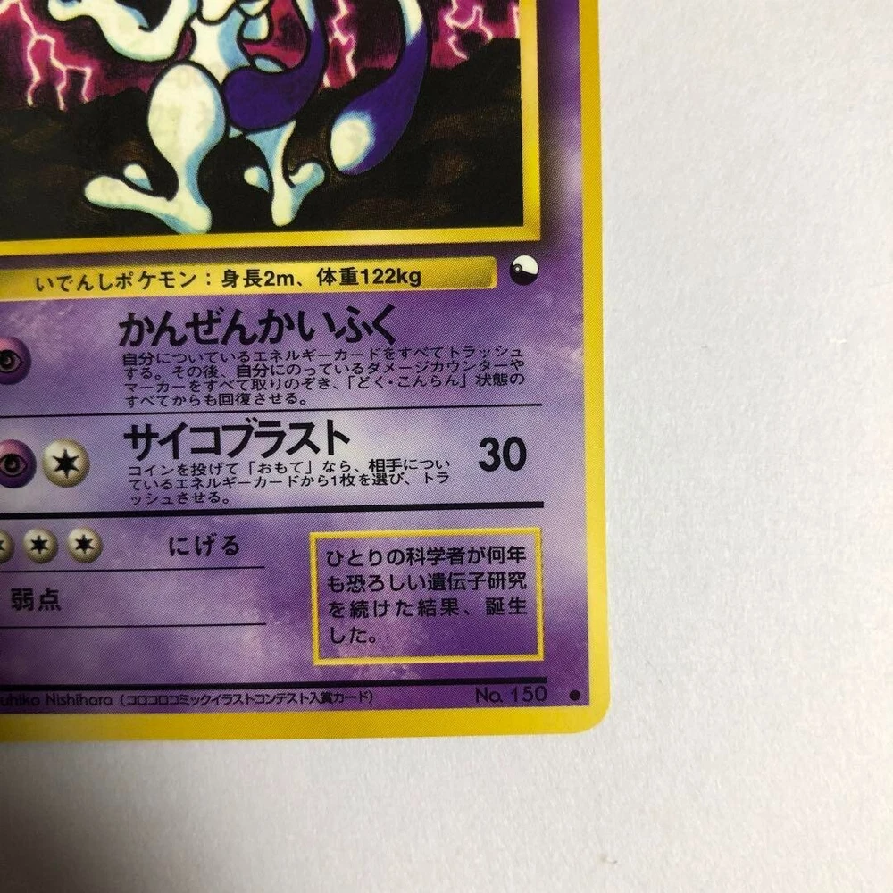 Age Level: 4+ Card Number: 150 Features: Promo Attack/Power: 30 Card Type: Pokémon Cost: 0 Shipping: With Tracking Number Finish: Regular California Prop 65 Warning: No Card Name: Mewtwo Manufacturer: Nintendo Vintage: Yes Autograph Format: N/A Year Manufactured: 1998 gtin13: N/A Game: Pokémon TCG Card Size: Standard HP: 80 Attribute/MTG:Color: Psychic Defense/Toughness: N/A UPC: N/A Country of Origin: Japan Material: Paper Character: Mewtwo Autographed: No Stage: Basic Language: Japanese Rarity: Rare