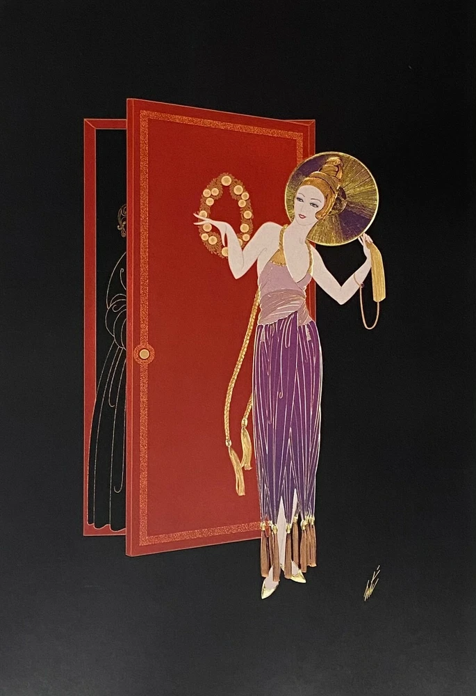 Erte New Years Eve Image Size 7.5" x 11" Custom Framed Size 14.5" x 21" Book Print Offset Lithograph Custom Framed in a 3" Gold Leaf Frame Double Matted with Black Outer Mat & Gold Inner All of Our Framing Materials are 100% Acid Free to Museum Standards Enclosed in Glass, Dust Covered Backed, Wired Ready for Hanging These are Professionally Custom Framed Not Store Bought Ready Made Frames If You Have Any Questions About Any Of Our Items Please Email Us. FREE SHIPPING IN THE USA 52-B