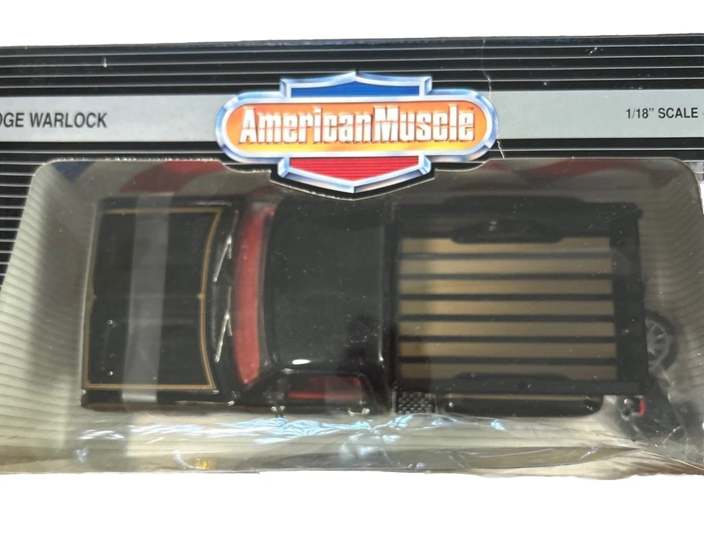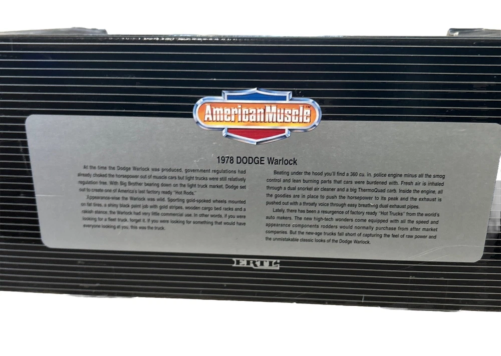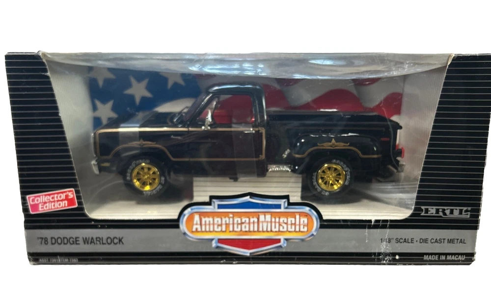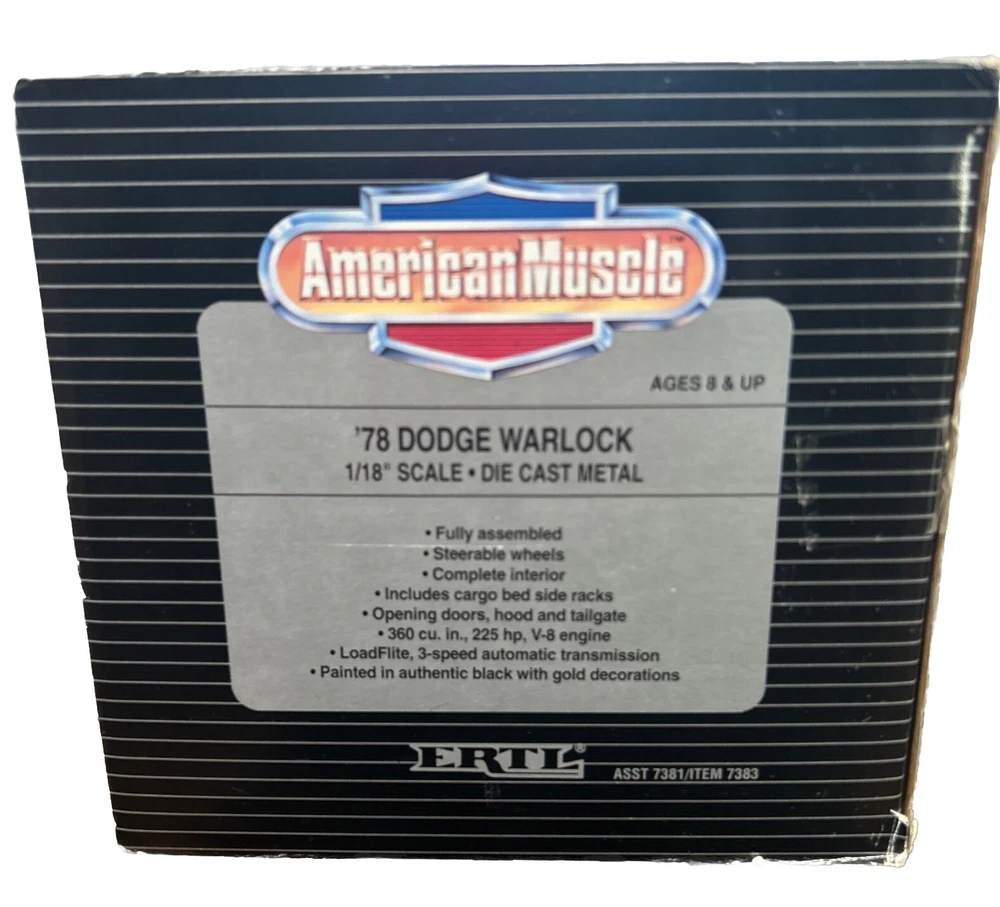 1:18 scale Ertl American Muscle diecast model of a 1978 Dodge Warlock pickup truck. This black truck is a special and limited edition, part of the ERTL American Muscle series. It comes with a case, stand, and an unopened box. Suitable for ages 8 and up, this detailed collectible is a great addition for fans of cars and trucks.